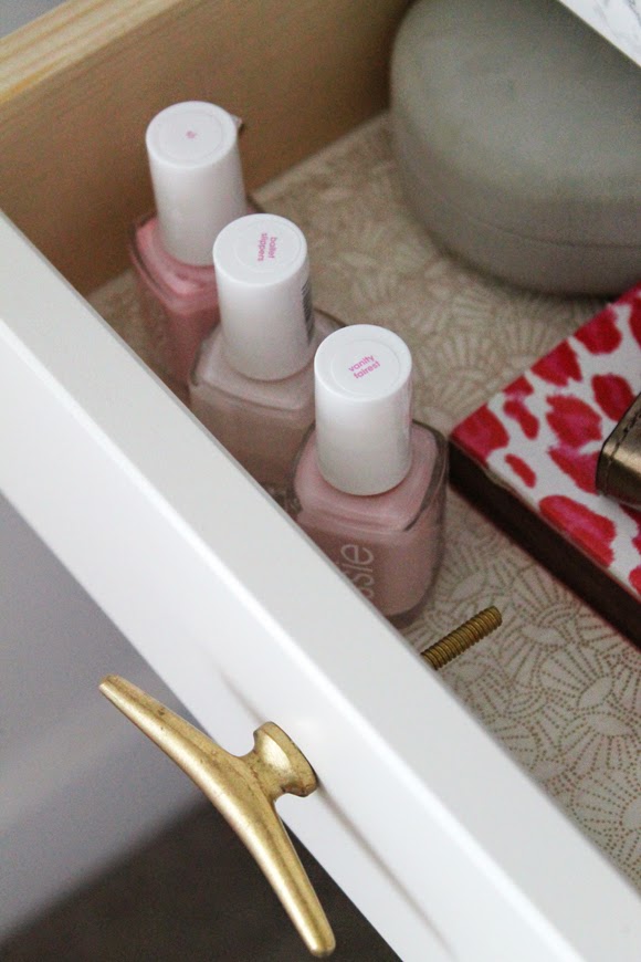 I also added some gold patterned paper as a drawer liner (as simple as cutting and gluing)