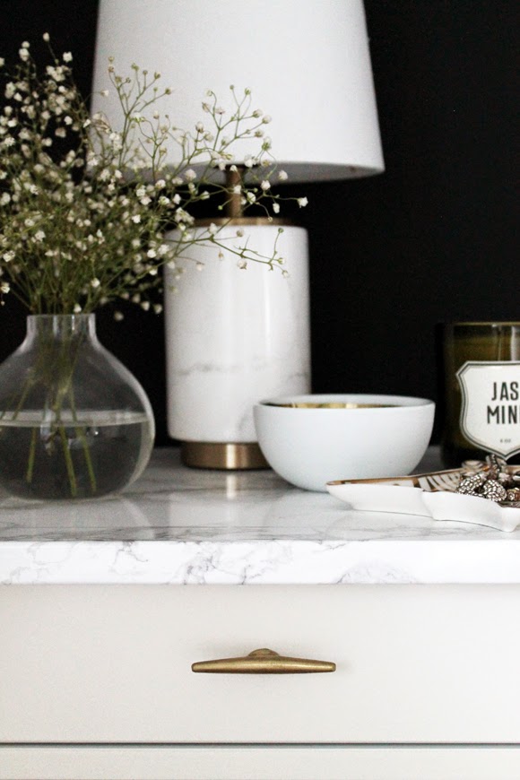 Sometimes it only takes a tiny tiny bit of creativity to transform a regular and affordable piece of furniture onto something pretty that you love. This is the case of this bedside table I got from Ikea, the Hemnes nightstand in white. When I bought it I knew exactly what I was going to do: add some marble self-adhesive paper on the top and change the pull to a brass one, that easy, that quick, yet it completely glams up the look, don’t you think? I already had the marble self-adhesive paper, so I only had to purchase the knob, which I got from Anthropologie for $9 ($6 if you’re in the US), so I would say this was a cheap fix 😉