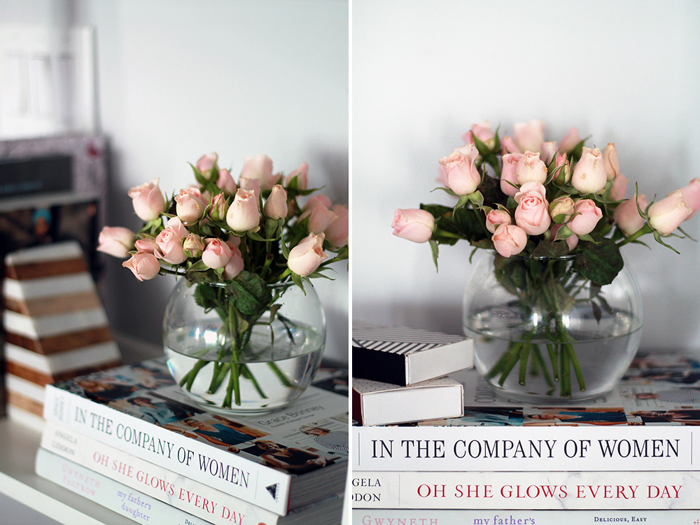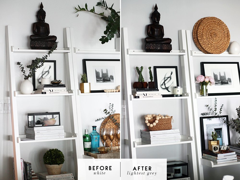 I decided to go with Lightest Grey (shocking I know), and only applied two coats (colour number is PR16RO8 and the paint is from their Premier Infinity Collection, in case you’re interested). The change is not dramatic at all and you’ll probably have a hard time spotting the difference (before and after at the end) but let me tell you, you can definitely tell in person and the colour I chose is exactly what I was looking for. A subtle but much needed change that got me into shelf-decorating (I have styled those shelves like a million times!), and now I’m most likely painting my dining and living in the same colour. Here’s how the wall looks now, though I’m still waiting for some frames to arrive so this will change again!