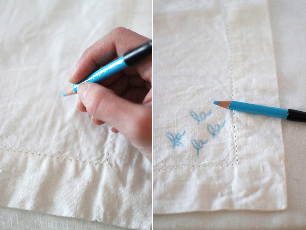 First you need some napkins you’re ok with using. I had these linen napkins from Ikea and thought they were perfect for this. They are $6 for a pack of 2, which I don’t think is bad at all, but you could also check stores like HomeSense, Winners, H&M as I’m sure you’d find something there too. Then you need a fabric pencil (like this one), scissors, and embroidery floss (I used DMC in 310 for the script and DMC 3821 for the edges and stars).