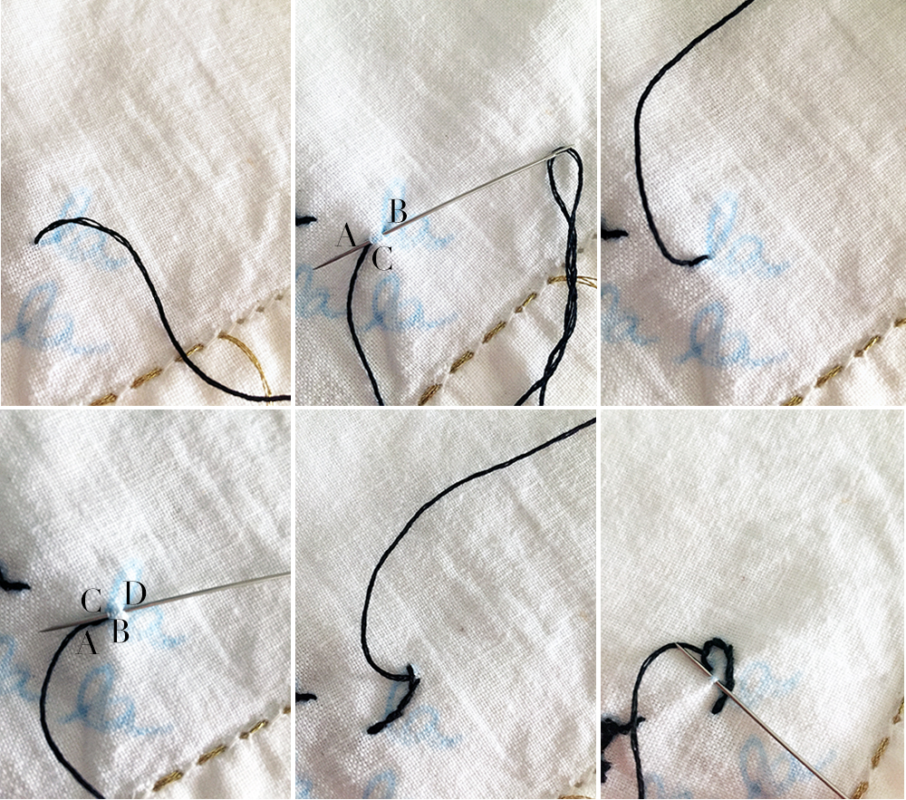 Insert the needle from the back of the napkin and bring it out from point A (where you inserted) to B. Bring out the needle on C (to the right of the thread and somewhere between A and B, closer to B) and insert on D (a stitch length away). Repeat until you have completed the outline and secure with a knot on the back side.