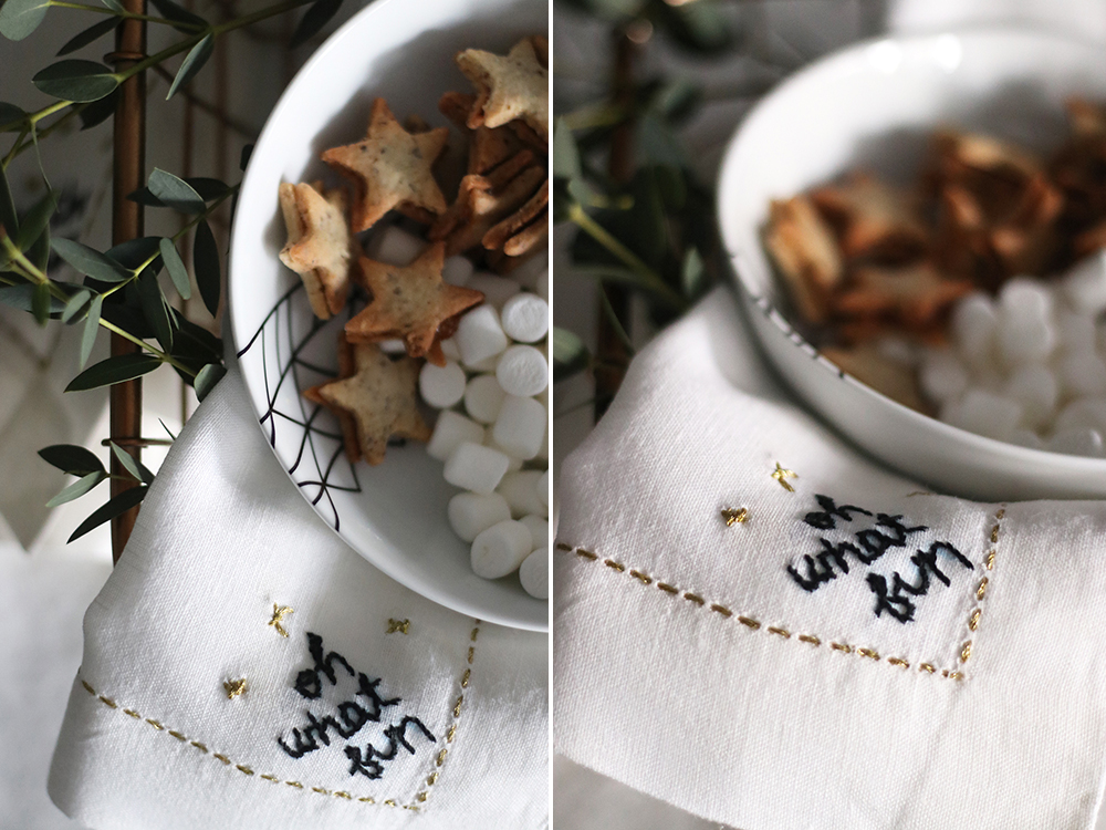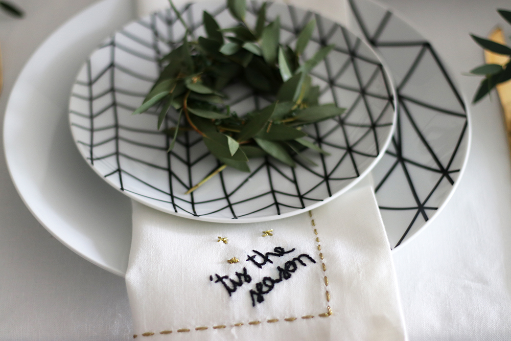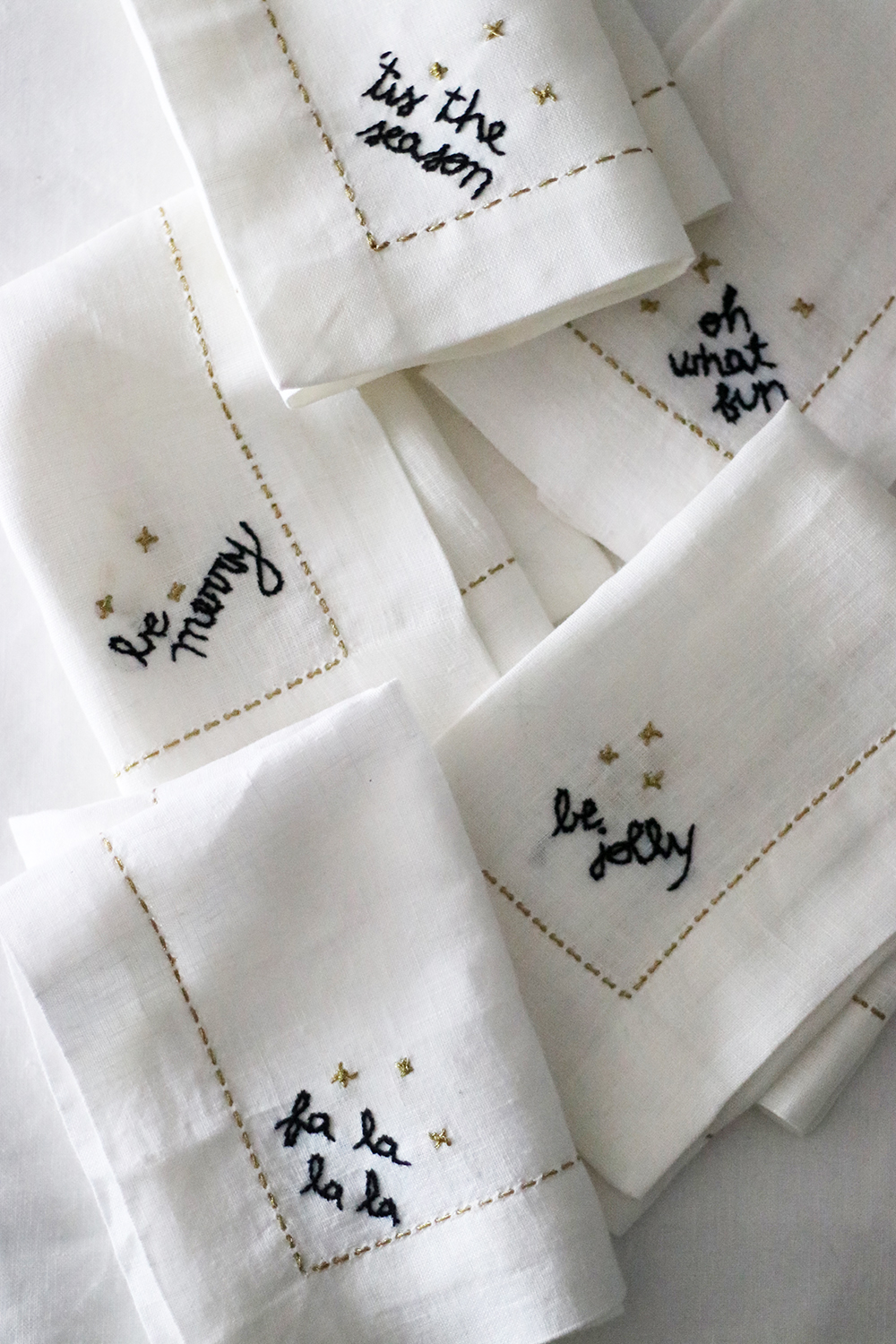 Today I want to show you these embroidered napkins I made with my mom that are perfect for taking your Holiday table scape game up a notch 😉 I hadn’t done any embroidering for years, but with my mom visiting (she’s a pro at embroidering and sewing) it was a fun project to take on together. They really are not that complicated and below I’m detailing the step-by-step in case you’re not familiar with embroidering stitches.