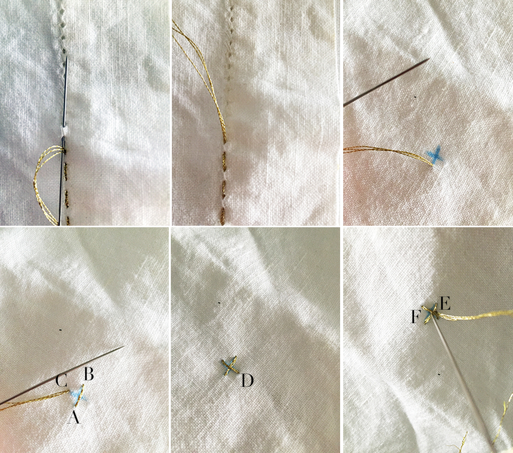 For the stars you’re going to make an “x” mark on the fabric with the pencil and follow from A to B to C and D to complete. Then secure the “x” with a single stitch from E to F.