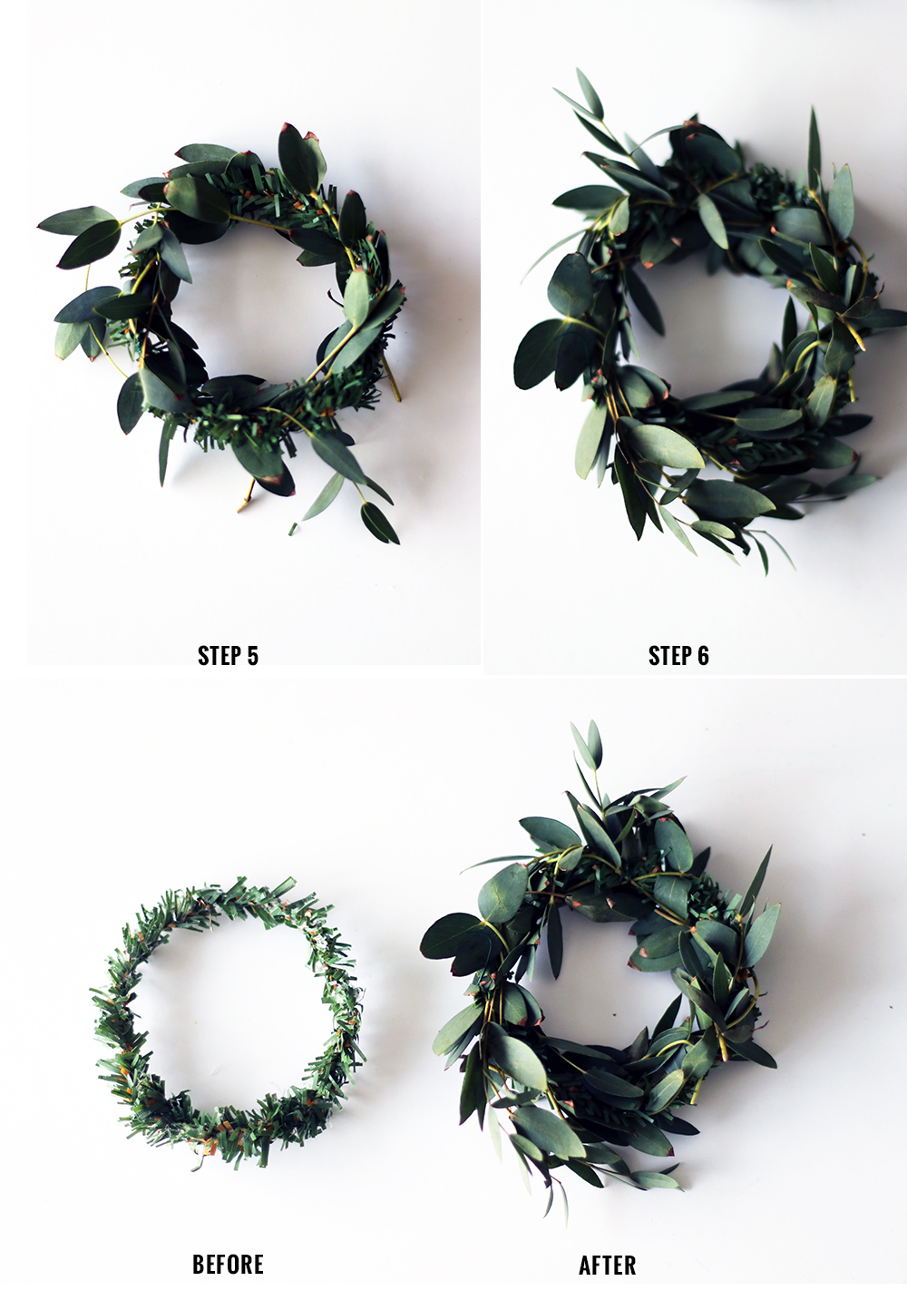 STEP 2 and 3: Grab a sprig of eucalyptus and wrap it around your shaped stem.