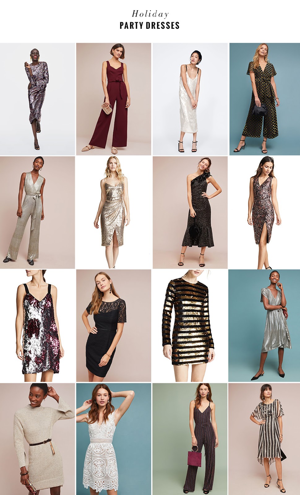 1. Zara Sequin Dress | 2. Anthropologie The Essential Belted Jumpsuit | 3. Zara Sequin Dress | 4. Anthropologie Metallic Polka Dot Jumpsuit | 5. Anthropologie Metallic Showstopper Jumpsuit | 6. Black Halo Bowery Sequin Sheath Dress | 7. Shoshanna Evadene One-Shoulder Dress | 8. Alice + Olivia Natalie Sequin Embroidered Dress | 9. Tanya Taylor Becca Dress | 10. Anthropologie Clara Sheath Dress | 11. RtA Crystal Sequined Dress | 12. Anthropologie Calina Wrap Dress | 13. Anthropologie Albedo Sweater Dress | 14. ML Monique Lhuillier Yolande Lace Dress | 15. Corey Lynn Calter Madga Striped Jumpsuit | 16. Anthropologie Shrie Striped Dress