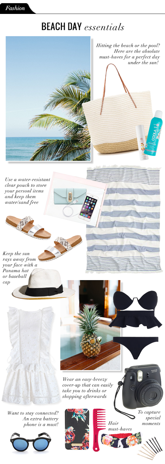 Beach Day Essentials: Bop Basics Twisted Colorblock Tote || Coola® sport SPF 30 unscented sunscreen spray || Passionflower & Argan Dry Oil Broad Spectrum SPF 50 || Loeffler Randall Paz two strap sandal || One Truffle The Clarity Document Case (on sale) || Rebecca Minkoff Mason Wallet || Biltmore® & Madewell Panama Hat || Zimmermann Hyper Eyelet Flip Dress (here too) || Zimmermann Anais Bonded Frill Bikini || Nine Space™ Carmel beach towel || Namrata Joshipura Floral Turban Headband || ban.do Model Bobby Pin Set || Sephora Mini Tidy Detangling Comb || Illesteva Leonard II Mirrored Sunglasses (similar for less) || Vince Camuto ‘Roami’ Battery Charger || Fuji Film Instax Mini Camera