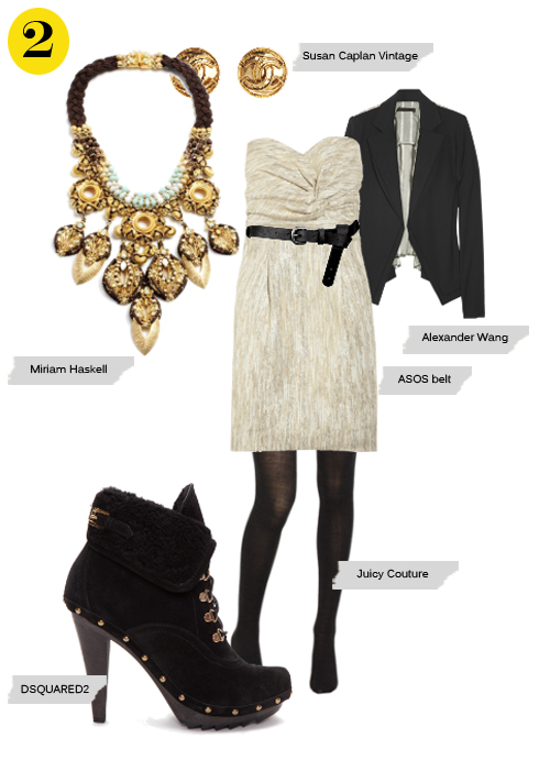 Susan Caplan vintage earrings, Miriam Haskell necklace, Alexander Wang blazer, ASOS leather boyfriend belt, Juicy Couture rhinestone tights, DSQUARED2 clog ankle boots.