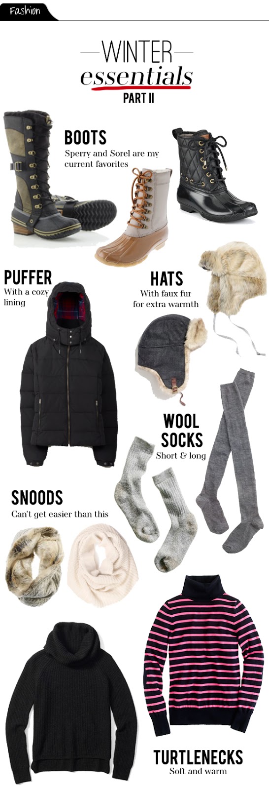 BOOTS: If you’re searching for a great pair of winter boots I highly recommend Sperry’s. They are insanely comfortable (they feel like you’re walking on a cloud), and they are super warm. I LOVE mine 😉 Sorel ‘Conquest Carly’ Boot / Sperry Top-Sider® for J.Crew two-tone tall Shearwater boots / Sperry Top-Sider Shearwater boots