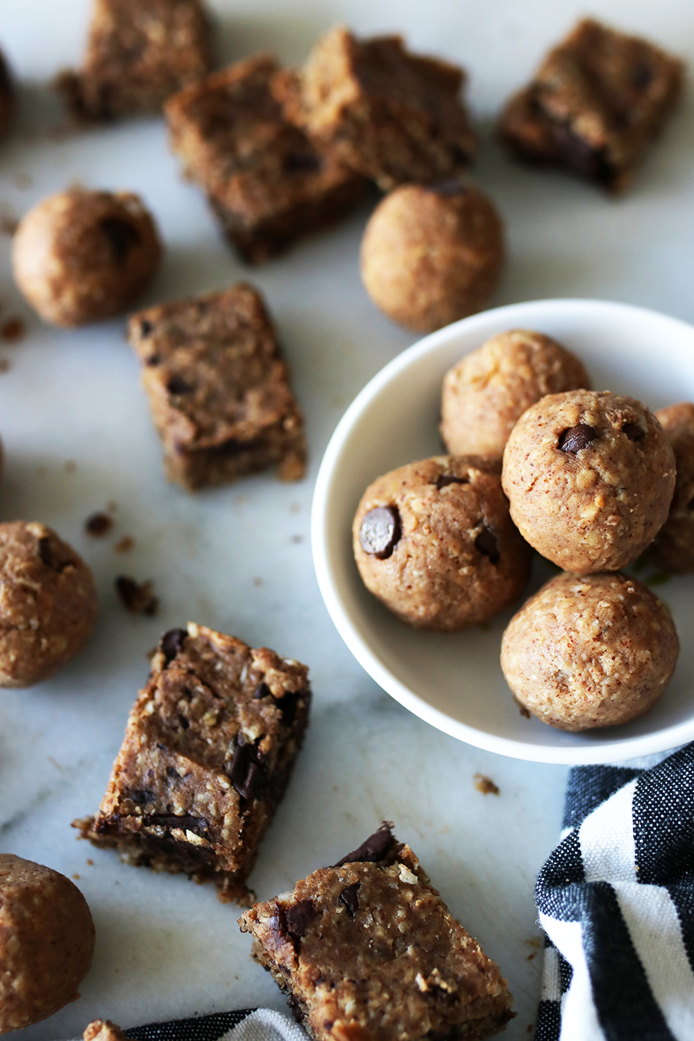 Lastly, 2 Oz semi-sweet chocolate chunks for the blondies, and about 1/4 cup for the bites (if you’re using 1/3 of the dough for bites and 2/3 for blondies). Otherwise, I’d say 1/2 cup – 3/4 cup of chocolate chunks or chips should be enough for the full recipe. Feel free to use raisins, dried apricots, or anything else you prefer.