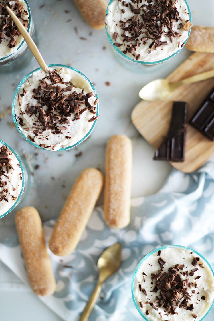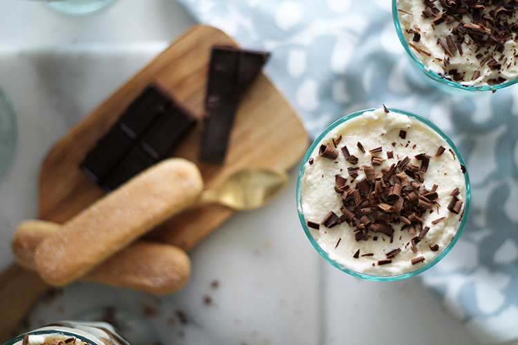 . To assemble, quickly dip each ladyfinger as you go (1 second each side), spread a layer of the mascarpone mix and add a spoonful of chocolate cream. Repeat layers until you have reached the top of your glass, mug or cup and finish it off with some grated dark chocolate on top.