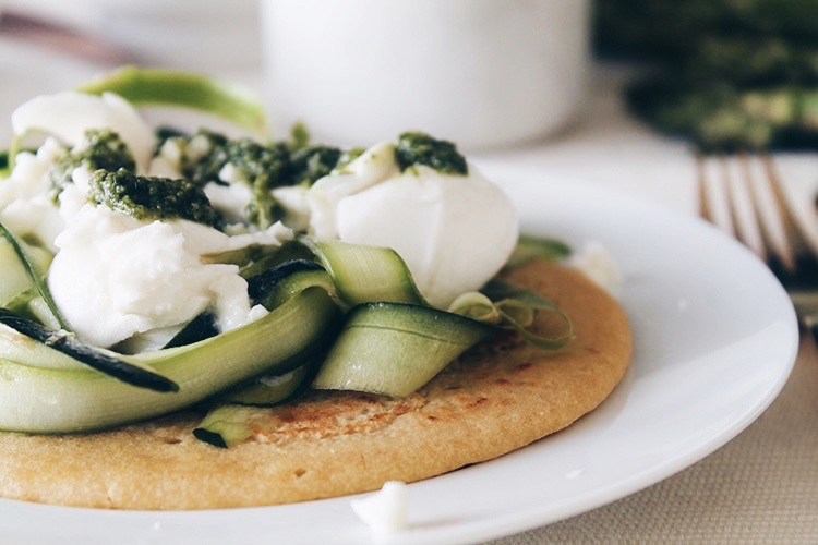 Toss the shaved zucchini + asparagus with the olive oil, lemon juice and salt. Place on your socca and top with the burrata and pesto. Super simple, fast to make and delicious!