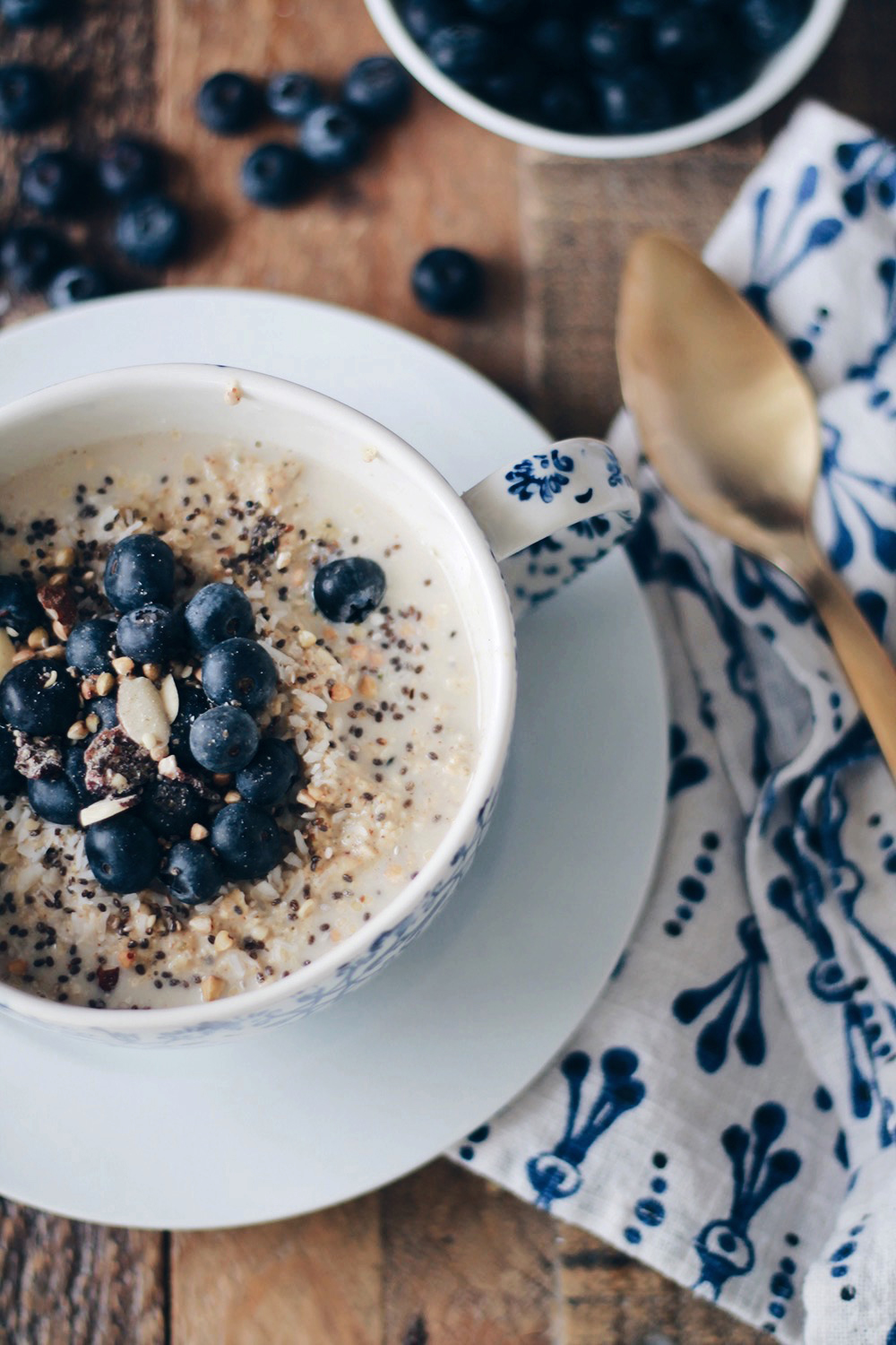 While I do get that a bowl of plain oatmeal is not exactly the most exciting meal, if you get a bit creative and “dress-up” your oats, you can end up having a really delicious breakfast. I think it all comes down to the add-ons and if you choose ones with great nutritional value, you’ll guarantee having the best of both worlds. This protein-packed blueberry oatmeal recipe is super easy to make and you can definitely customize it and swap some ingredients according to your personal preferences or diet requirements. I drink almond milk, but you can swap it for regular milk, soy milk, oat milk or any kind you fancy. Same goes with the fruit you add, instead of blueberries you can add bananas, strawberries, peach…It only takes a few minutes to make and there’s basically no prep needed 🙂