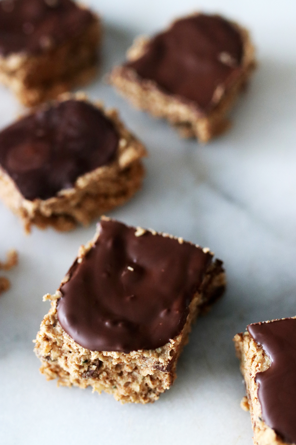 . Once the dough has cooled, spread the melted chocolate on top and transfer to the fridge*. Once the chocolate has hardened, cut into squares and store in the fridge in an air tight container for a few days 🙂