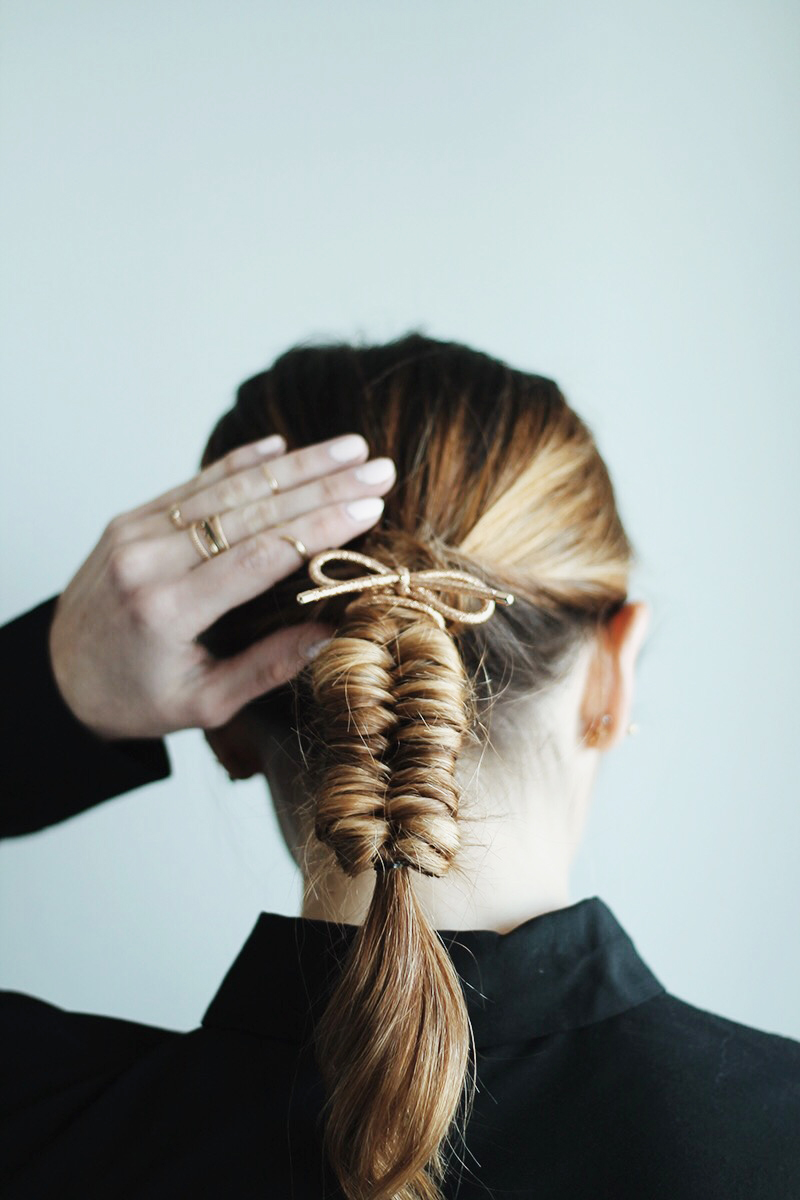 When you have some killer hair tools and a friend who is a hairstylist, it becomes a bit of a no-brainer to pair them up for some great hairstyles, so I asked my friend and hairstylist Aylin to create some looks to inspire you all for the Holidays. We (I mean she!) created four easy looks with step-by-step instructions for you to recreate in case you feel inclined to style your hair for the festivities 😉 We used the T3 Micro convertible wand and Starightening Iron (many of you have asked about T3 Micro tools and they are seriously amazing, couldn’t be happier with them) and Bumble and Bumble Does It All Light hold Hairspray, Full Form Mouse and Spray de Mode Flexible Hold Hairspray.