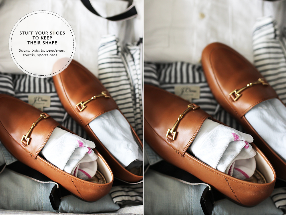 TIP #3: I usually pack my shoes in cotton bags (like these) but if I’m traveling with new shoes that I haven’t worn I skip the bag. But, regardless of how I pack them, I ALWAYS stuff them with smaller items for two reasons: one, to use space efficiently, and two, to keep their shape. Same goes with hats, which I place at the centre of the suitcase and fill the space around until it’s all even.