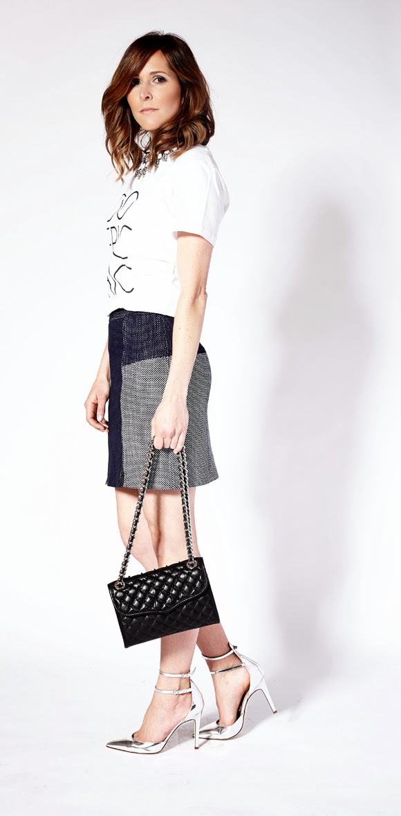 Wearing a Song of Style for eLuxe Do Epic Chic Tee (I was surprised at how incredibly soft it was), Tibi Denim Basket Weave Skirt, Rebecca Minkoff quilted bag, and J.Crew Strappy Mirror metallic pumps