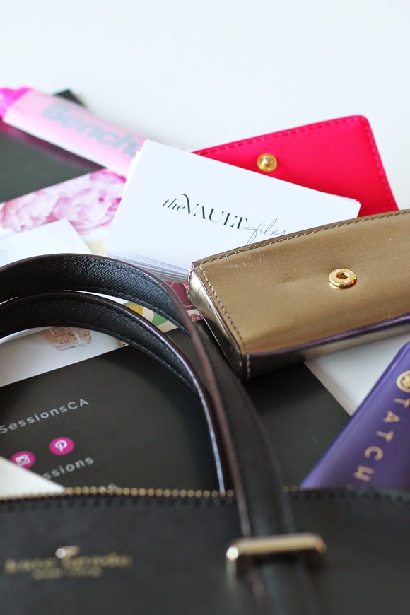 Conference essentials plus a few freebies from the first day: Notebook / Backup battery / Business cards / Hand Lotion / Lip Gloss / Pen / Blush / Nail Polish
