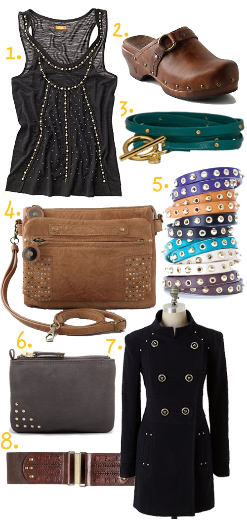 1. Madewell Studded ribbon-trim tank. 2. Anthropologie Cantabria Clogs. 3. Gorjana Graham Leather Studded Wrap. 4. Twelfth St. by Cynthia Vincent Emery Studded Cross Body Bag. 5. Linea Pelle Grommet and Studded Skinny Double Wrap Bracelet. 6. Gorjana Thompson Pouchette. 7. Anthropologie Iberia Coat. 8. Banana Republic Stretch Web and Studs Belt.