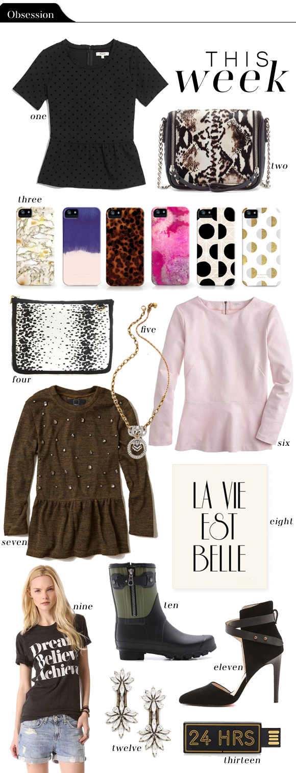 Six: J.Crew Ponte peplum shirt: Love the simplicity yet elegance of this top, and how sweet is this color? Would look great with black, or grey.