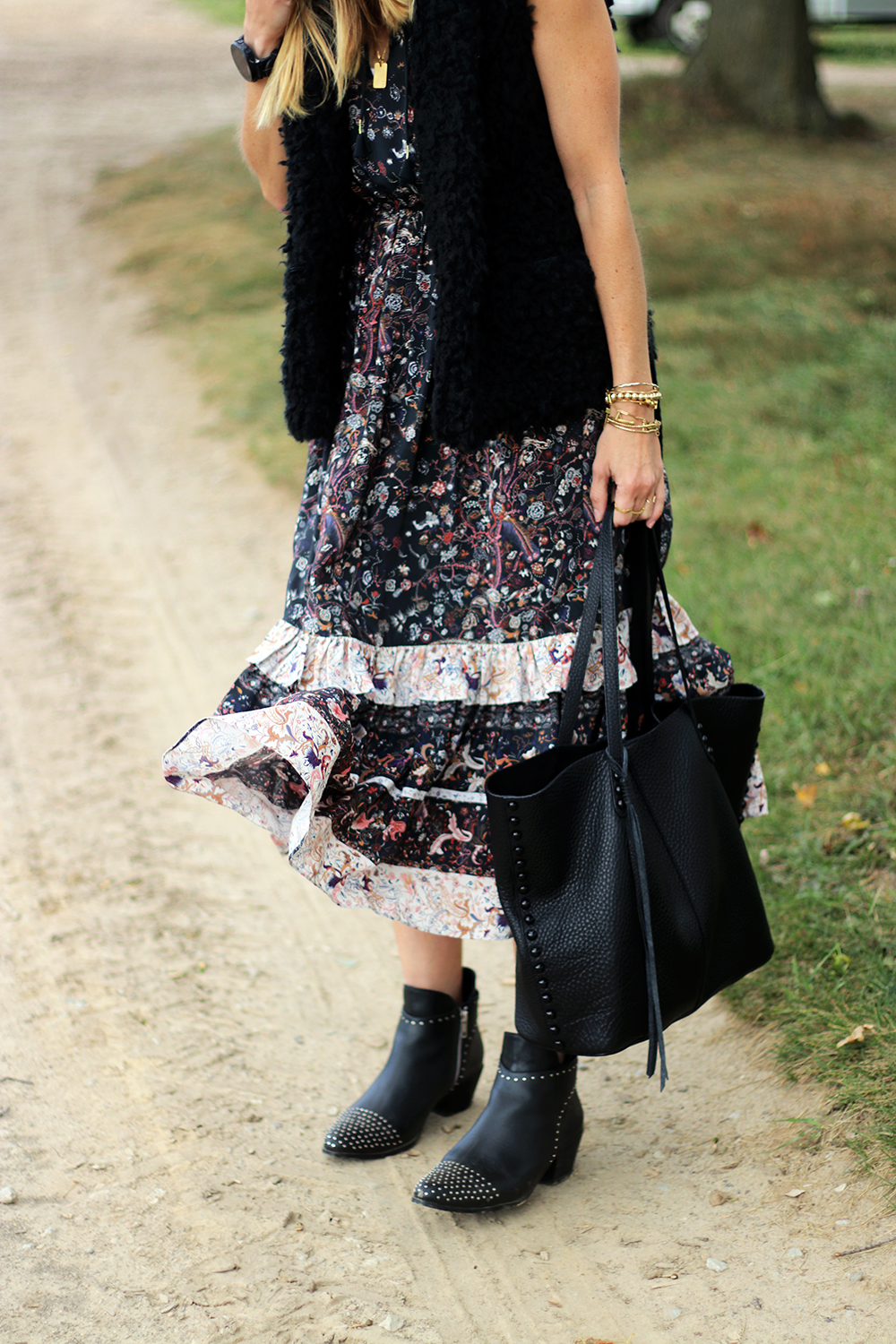 WEARING: Illesteva Sunglasses | Wilfred Free Vest (old, similar, similar, similar) | Ulla Johnson Dress (sold out, similar for $57, similar for $248) | Cartel Juana Black Booties (gifted) | Rebecca Minkoff Medium Unlined Tote | Muriel Co. Bracelets | Madewell Chain Bracelet Set (30% off right now)