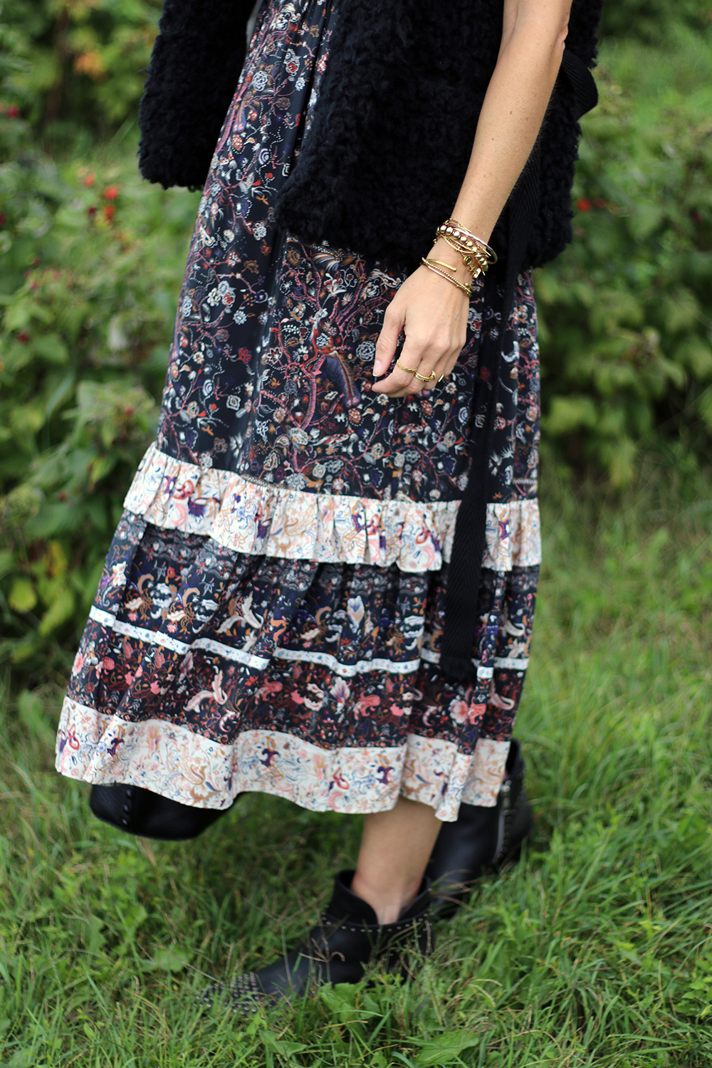 Last week my friend Victoria and I decided to visit Andrew’s Scenic Acres, ever been? They have the most beautiful fields of flowers and after seeing photos on Instagram we had to make our way there! We are definitely going back as we had little time to wander around and want to go back to pick up some flowers and pumpkins once they get more of them in. The weather was a bit chilly so I threw this super cozy vest I have (sadly it’s old, but I found some that are very similar, see below!) over a maxi and wore these super cool booties, anyone else loves the maxi-dress/booties combo? I loooove it. It’s the perfect way to get the most use of your dresses and as it gets colder you just have to add more layers. A leather jacket gives it an edgy vibe, a long cardi will give you warmth, and a chunky sweater will make it look like a skirt/top combo 😉