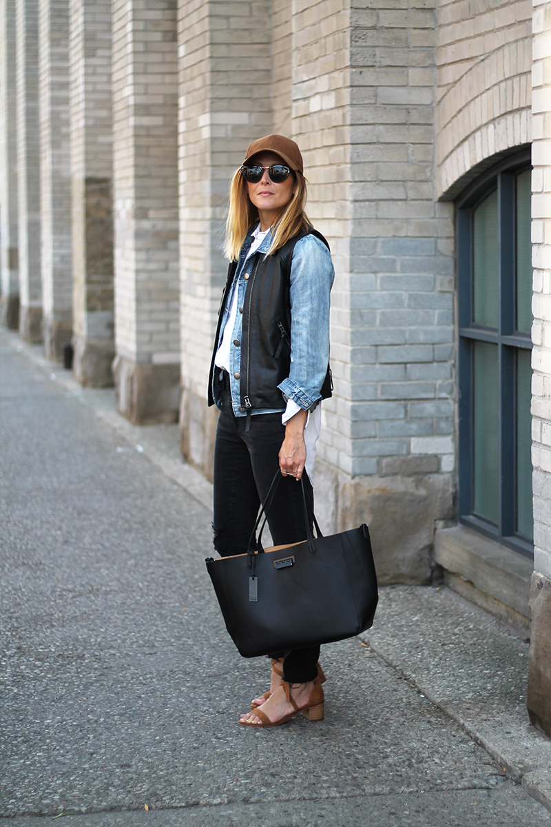 WEARING: Wilfred Free Emesa Hat | Spitfire Helix Sunglasses (old, these and these look identical and are less than $20) | Madewell Shirt | J.Crew Denim Jacket | Madewell Leather Vest (old, similar on sale | Madewell High Rise Skinny Skinny Jeans | Zac Zac Posen Tote | Steve Madden Rizzaa Ankle Strap Sandals