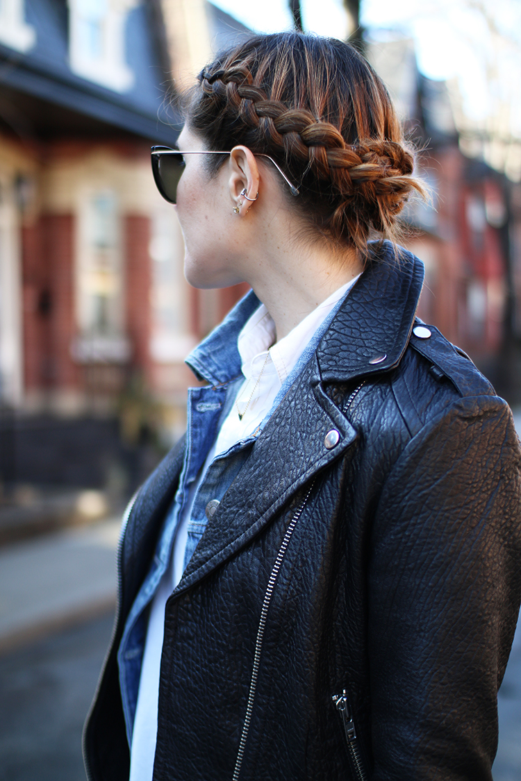 GET THE LOOK: Spitfire Helix Sunglasses (similar) | Madewell Shirt | J.Crew Factory Denim Jacket (similar) | Mackage Rumer Leather Jacket | Coach Saddle Bag 23 in Whiplash Leather and Stegosaurus Bag charm (c/o) | 7FAM Skinny Jeans | J.Crew Essie Pumps (c/o) | Hair by Cabello by Carolina