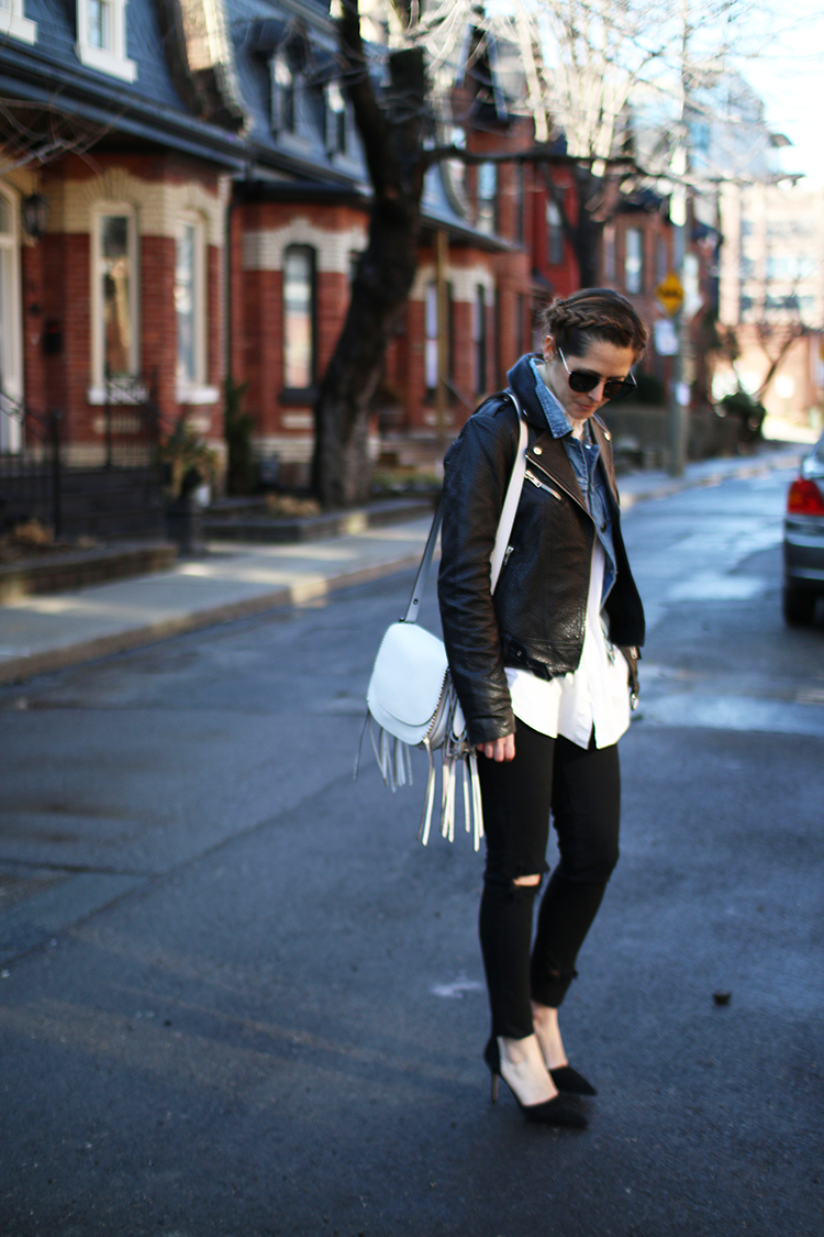 GET THE LOOK: Spitfire Helix Sunglasses (similar) | Madewell Shirt | J.Crew Factory Denim Jacket (similar) | Mackage Rumer Leather Jacket | Coach Saddle Bag 23 in Whiplash Leather and Stegosaurus Bag charm (c/o) | 7FAM Skinny Jeans | J.Crew Essie Pumps (c/o) | Hair by Cabello by Carolina