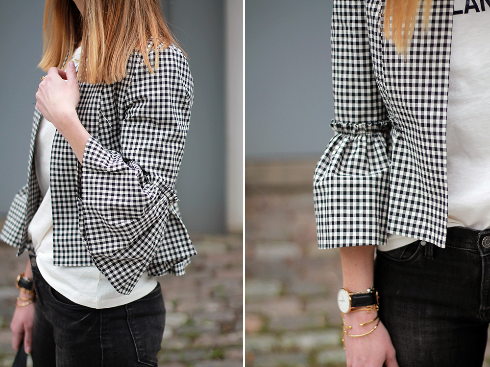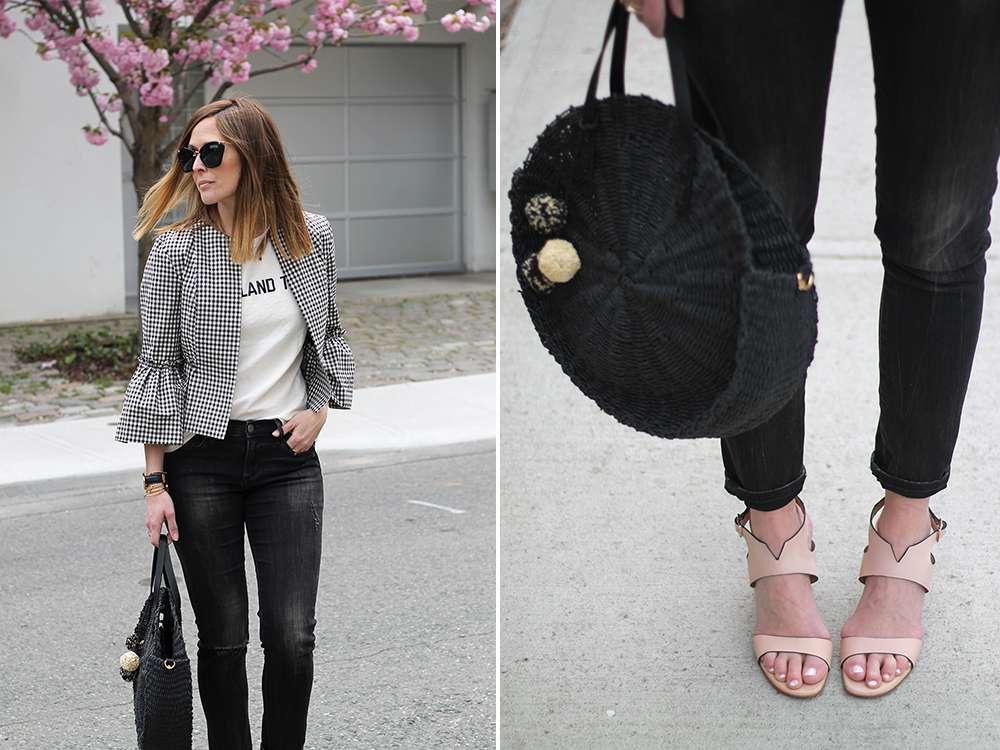 WEARING: Miu Miu Sunglasses (these from Prada are similar and $160) | J.Crew On Island Time T-Shirt | Topshop Crop Gingham Jacket (solid colors here) | Banana Republic Jeans (old, similar) | Zara Tote | La Canadienne Ruth Sandals (gifted) | Daniel Wellington Classic Sheffield (gifted)