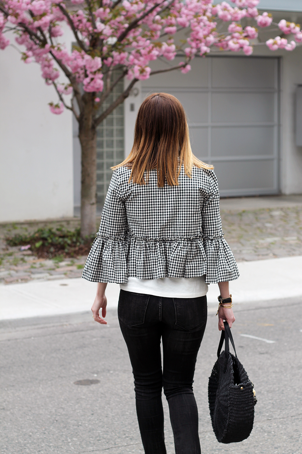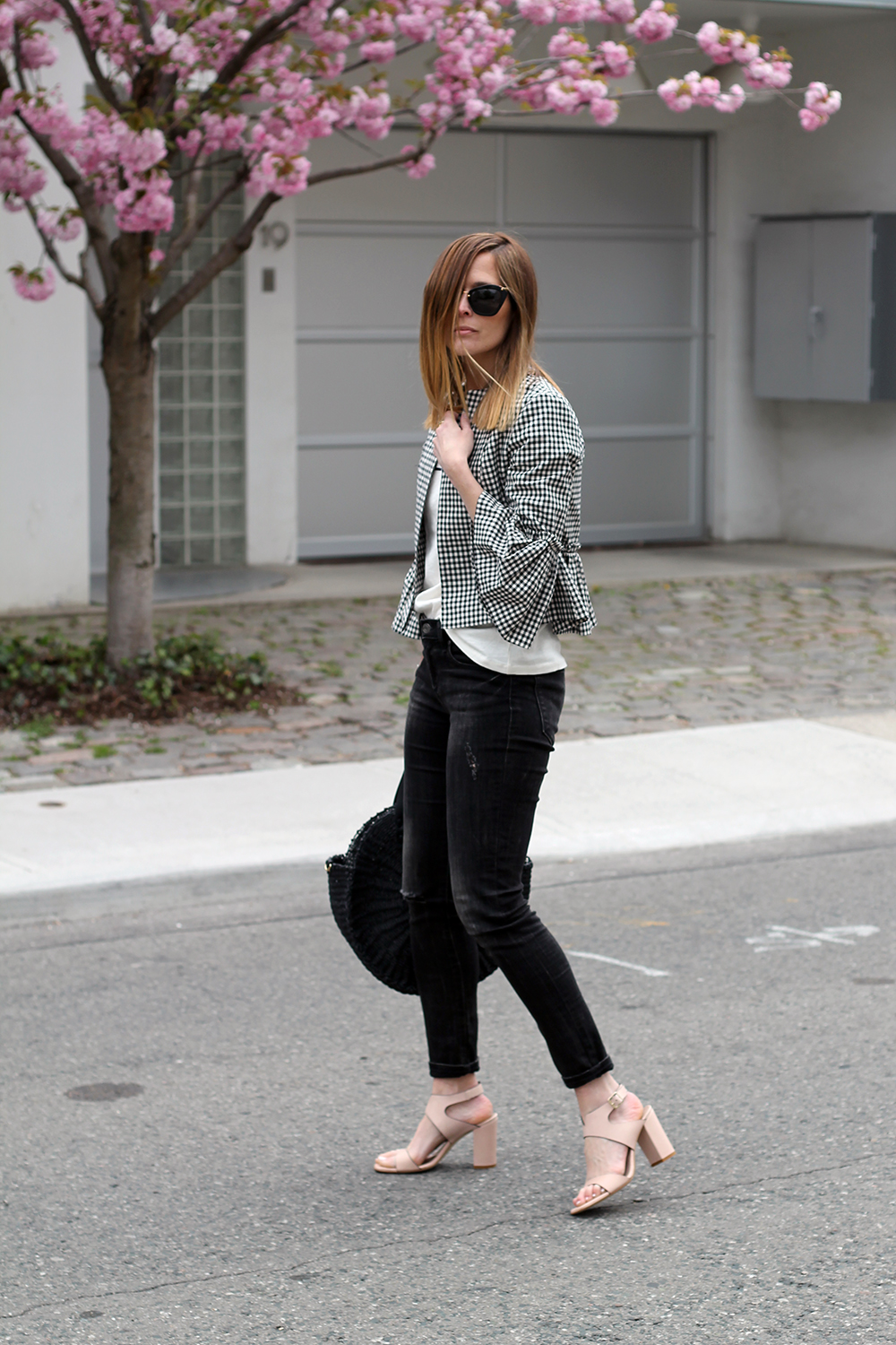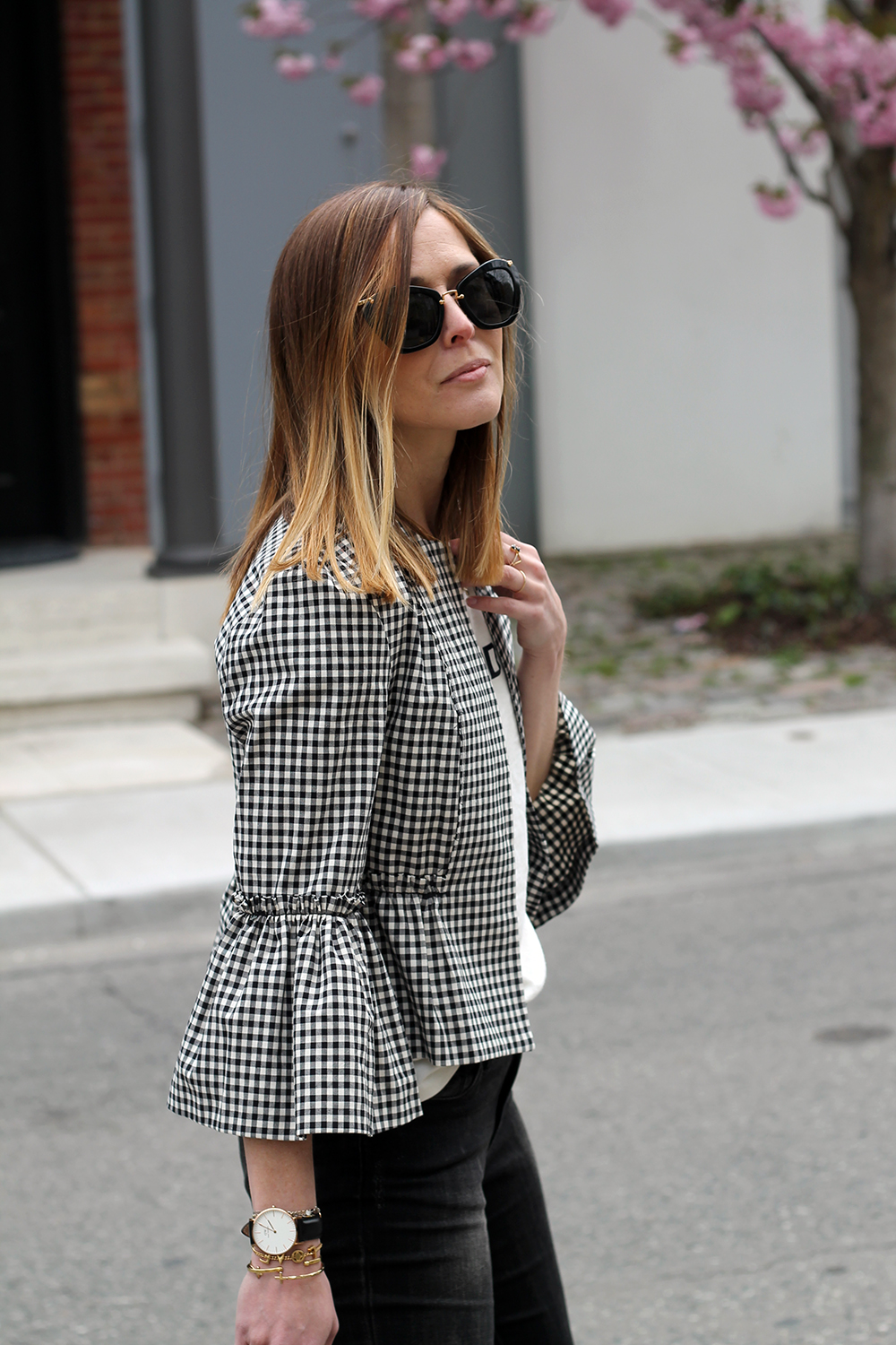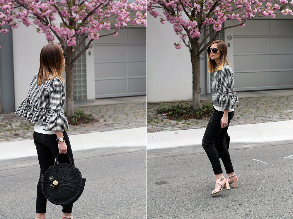 WEARING: Miu Miu Sunglasses (these from Prada are similar and $160) | J.Crew On Island Time T-Shirt | Topshop Crop Gingham Jacket (solid colors here) | Banana Republic Jeans (old, similar) | Zara Tote | La Canadienne Ruth Sandals (gifted) | Daniel Wellington Classic Sheffield (gifted)