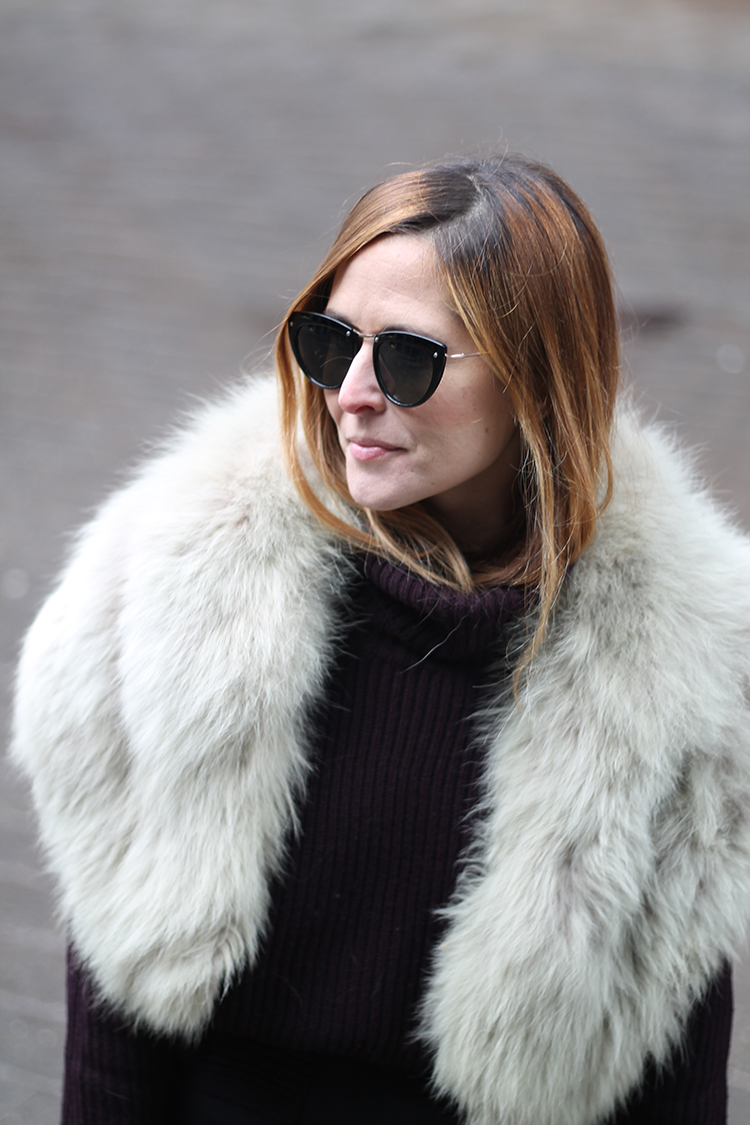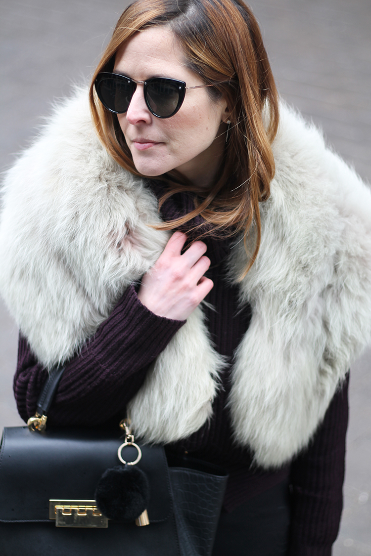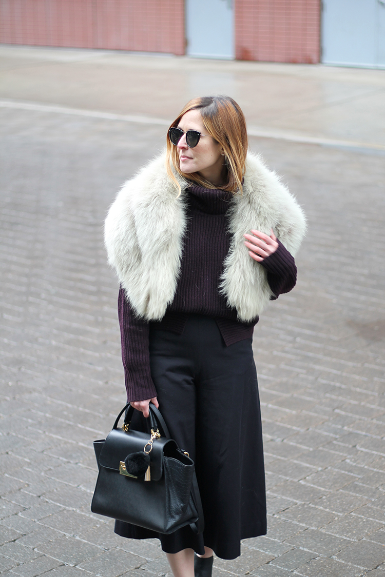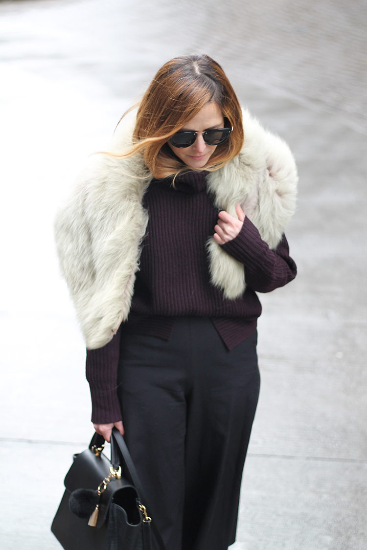 THE LOOK: Spitfire Helix Sunglasses (similar) | Faux Fur Stole (old, similar) | Wilfred Turtleneck (c/o) | Zac Zac Posen Eartha Bag | BaubleBar Fuzzy Pom Keychain (c/o) | COS Loose Fit Cropped Trousers (similar) | Marc Fisher Yale Chelsea Booties