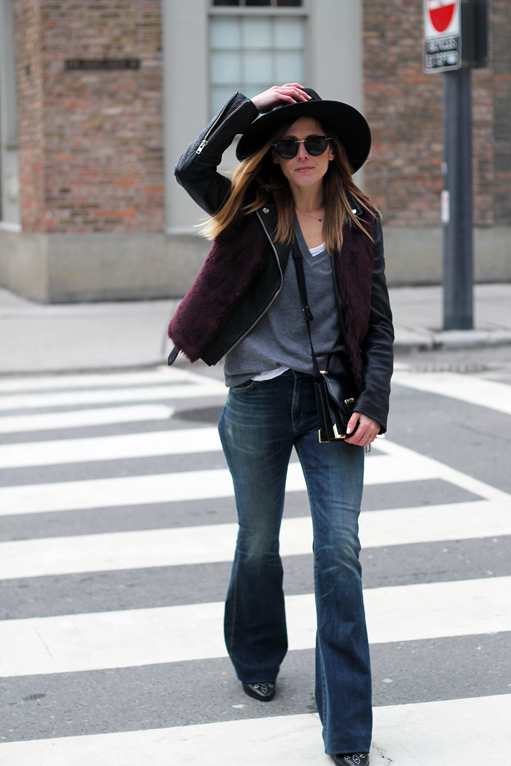 Wearing: Joe Fresh Wide Brim Fedora (old, similar) | Spitfire Sunglasses (also old, these are very similar and a steal, $7 people!) | Rag & Bone V-Neck Sweater (identical) | Mackage Rumer Leather Jacket | Aritzia Faux Fur Vest (old, this one looks amazing!) | Citizens of Humanity Fleetwood High Rise Flare Jeans | La Canadienne Luciana Boots (gifted) | Mackge Rubie Cross Body Bag