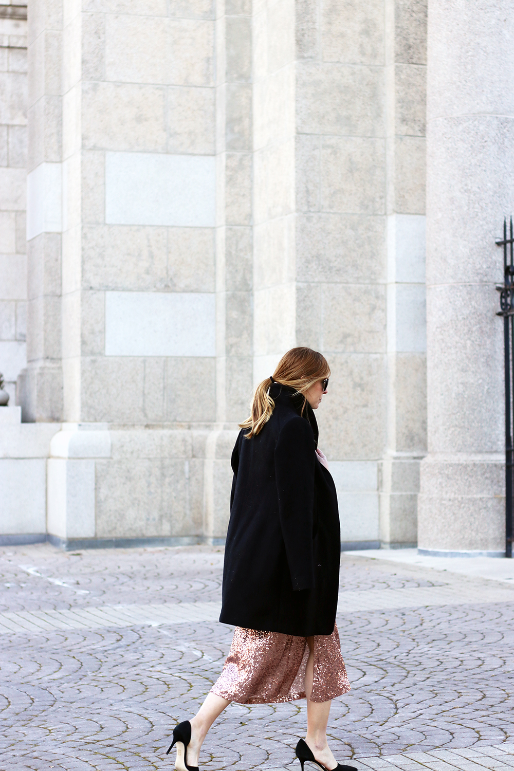 Happy Friday! Earlier this week I showed you a way to style your sequin dress for the Holidays and today I’m sharing another way to remix it to get the most out of it. In this case, instead of layering a sweater or top over it to make it look like a skirt, go with an under layer like a long sleeve tee or turtleneck. Just keep it slim fitting (so that you’re not adding extra bulk) and perhaps add a good pair of statement earrings to spice things up (like these or these!). What do you think?
