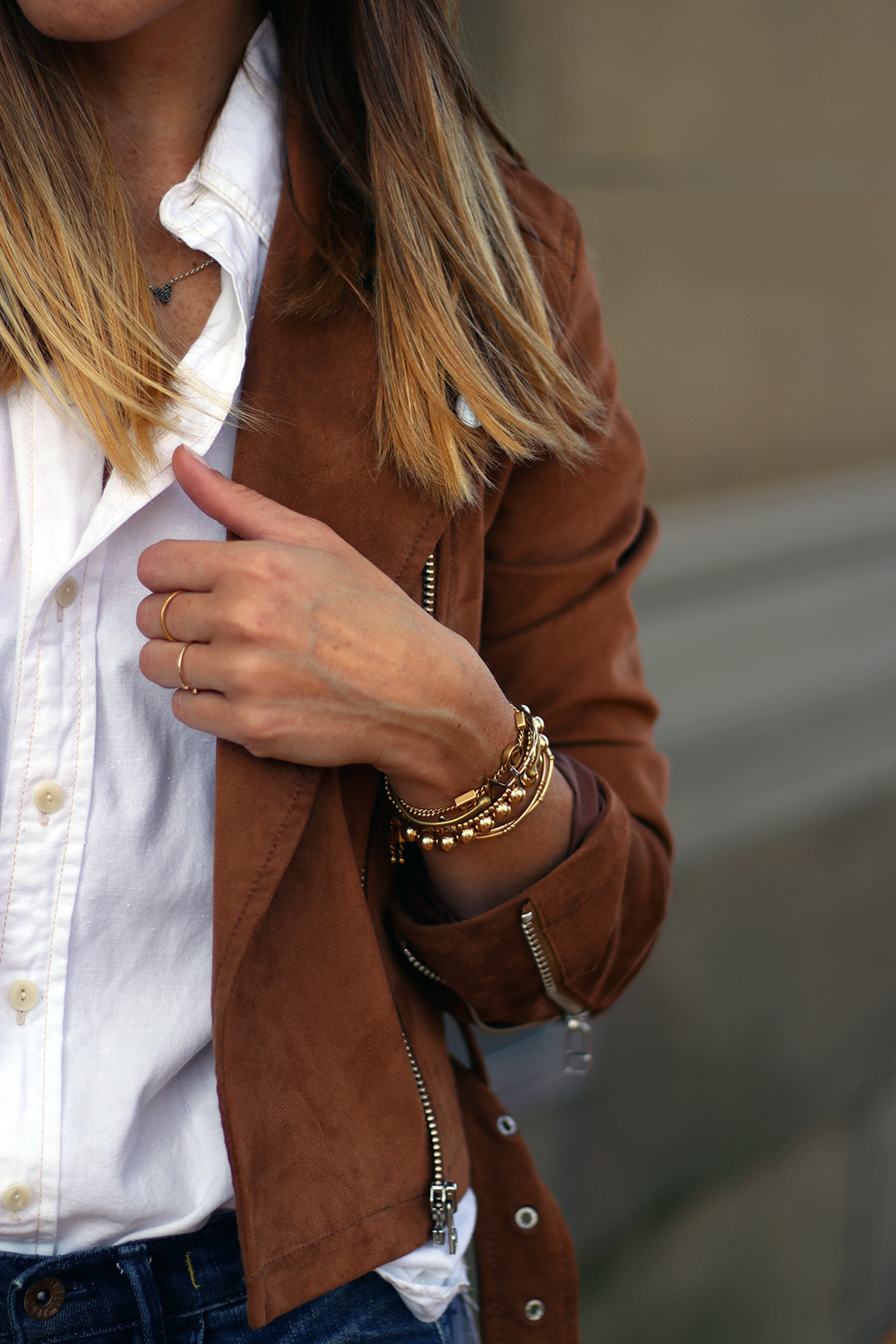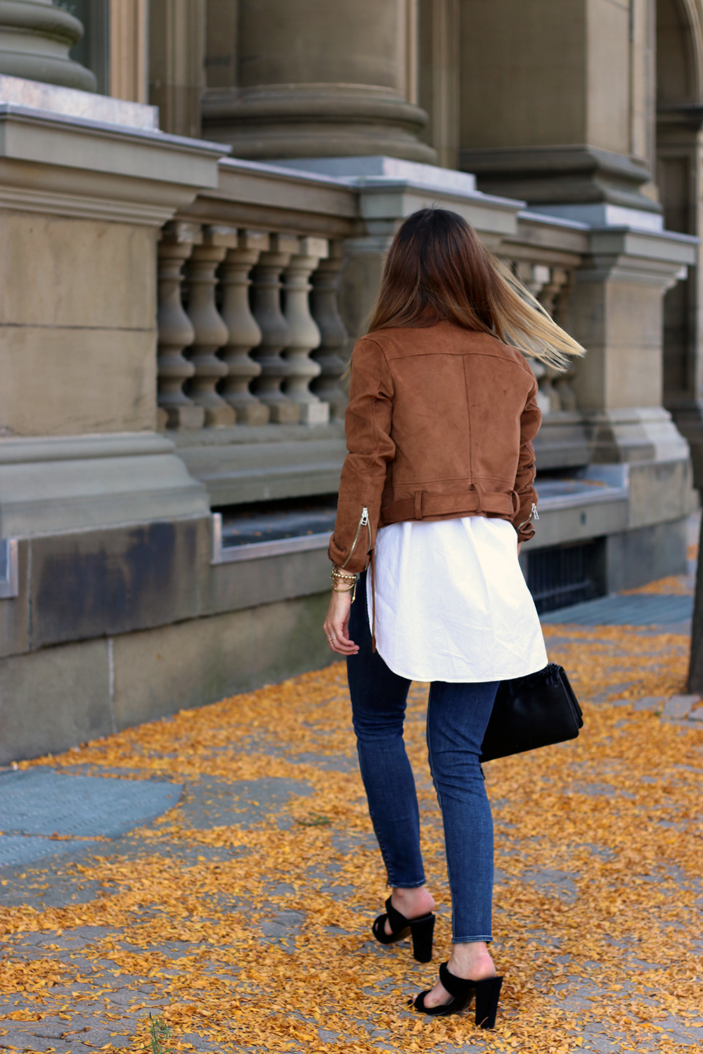 WEARING: Illesteva Sunglasses | Madewell Shirt (similar, similar) | Babaton Faux Suede Jacket (old, this one is veeeery similar in style and price point) | Old Madewell Jeans (these have a very similar wash) | Kendall & Kylie Slides | Rebecca Minkoff Love Cross Body Bag