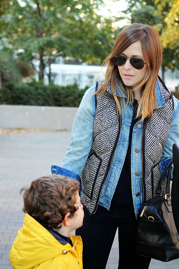 Wearing: Ray-Ban Original 58mm Aviators / Joe Fresh Sweater (old, identical) / J.Crew Factory Denim Jacket / J.Crew Herringbone Vest (super similar) / Madewell Skinny Skinny Zip jeans / Marais Fancy Slipper (on sale) / Joe Fresh Hat (identical) / Tory Burch Robinson Satchel (square version)