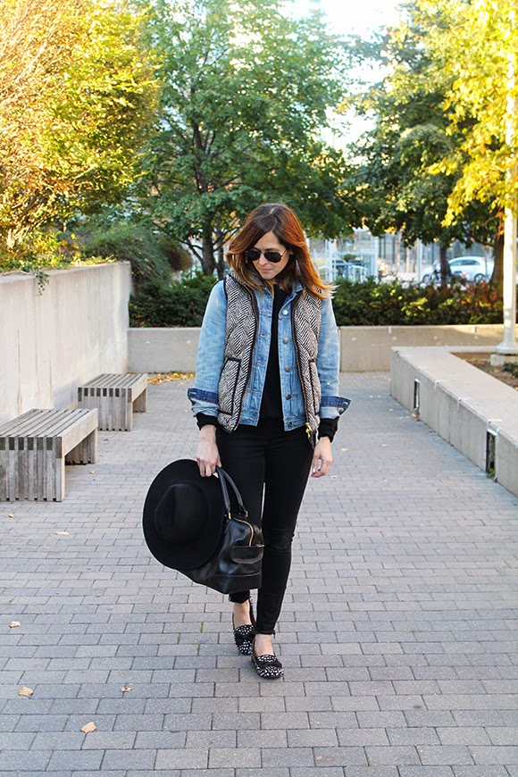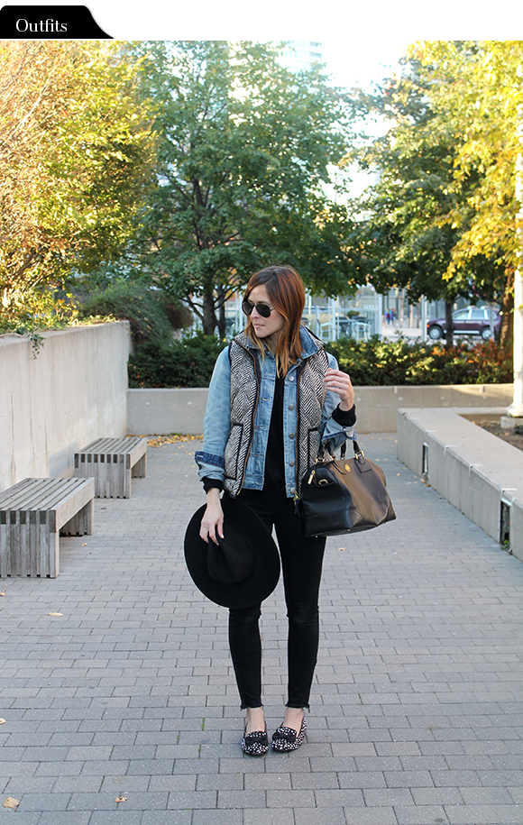 Wearing: Ray-Ban Original 58mm Aviators / Joe Fresh Sweater (old, identical) / J.Crew Factory Denim Jacket / J.Crew Herringbone Vest  (super similar) / Madewell Skinny Skinny Zip jeans / Marais Fancy Slipper (on sale) / Joe Fresh Hat (identical) / Tory Burch Robinson Satchel (square version)