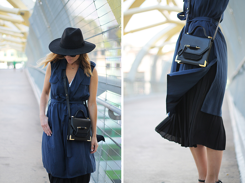 WEARING: Madewell Sleeveless Trench (very similar, similar, similar in black) | Uniqlo Pleated Skirt (similar) | Joe Fresh Wide Brim Fedora (old, similar) | Mackage Rubie Crossbody | Le Chateau Ankle Strap Heels | Spitfire Helix Sunglasses (similar) | Photos and Hair by Aylin Cabello
