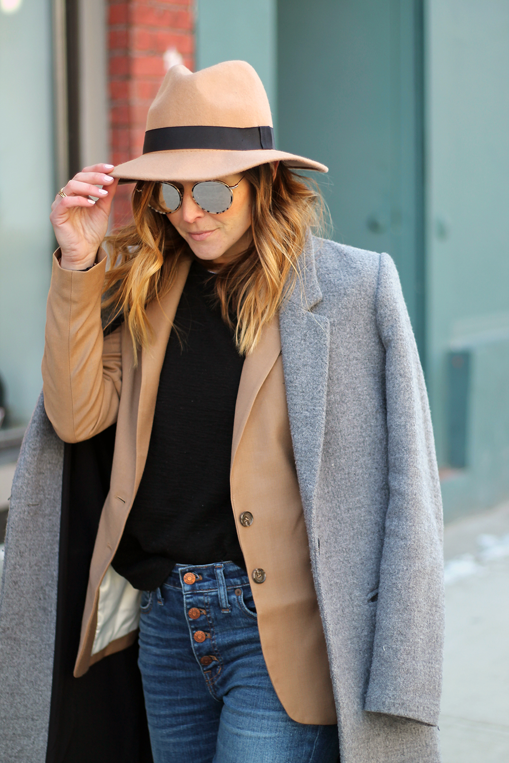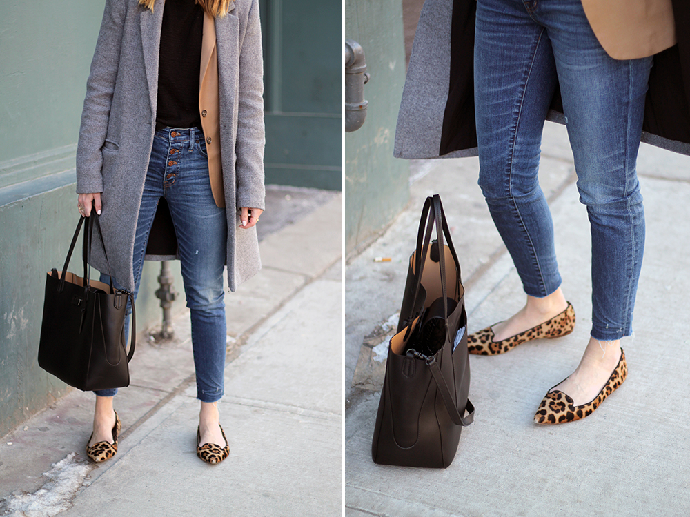 WEARING: Similar Sweater | Baukjen Westbury Blazer (gifted) | Zara Coat (old) | Madewell High-Rise Skinny Jeans Button Through Edition | Illesteva Wynwood Sunglasses (also here) | J.Crew Leopard Flats (oldies, similar also by them) | Zac Zac Posen Eartha Shopper | Aldo Fedora (oldie)