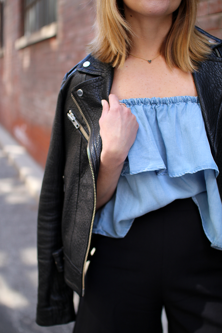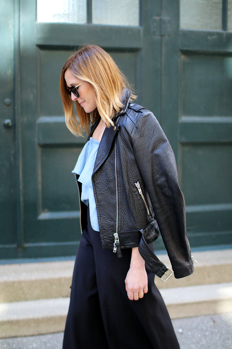WEARING: Zara Frilled Top (there’s a dress version too, and similar, similar) | Cos Culottes (old, similar, similar) | Spitfire Helix Sunglasses (old, similar) | Rebecca Minkoff Love Crossbody | Mackage Rumer Leather Jacket | Aldo Cardross Sandals | Mejuri Black Heart Necklace (gifted)