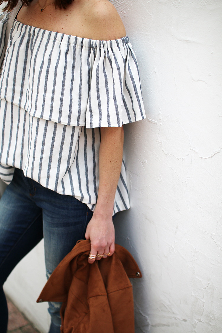 THE LOOK: Banana Republic Off-the-Shoulder Striped Top | Talula Morton Jacket (similar for just $39.99!) | Banana Republic Medium Wash Skinny Ankle Jeans | Coach Saddle bag in Whiplash (c/o) | Sorel Joanie Wedge Sandal (c/o) | Spitfire Helix Sunglasses (similar for $20) | Mejuri Black Heart Necklace (c/o)