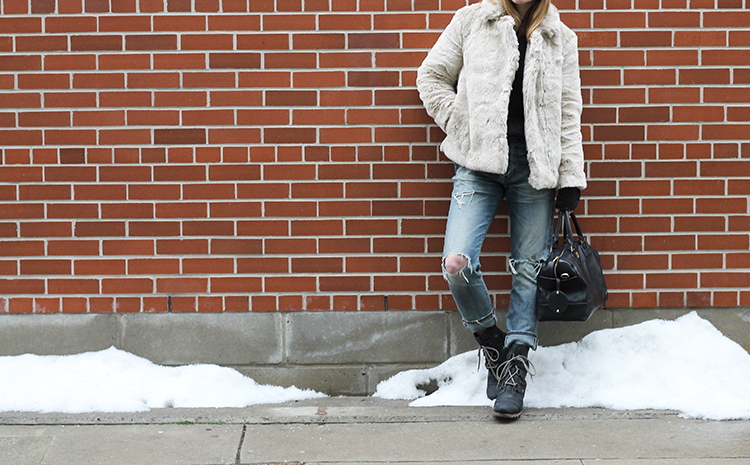 You would think that a Faux Fur jacket and destroyed boyfriend jeans don’t exactly go together but I in fact like the contrast and love the small touch of “glam” the jacket gives this “weekend brunch outfit” as I like to call it 😉 It serisouly is the comfiest of all: slim but relaxed denim (my fave boyfriend jeans), the softest and coziest jacket, and the most comfortable wedge booties to stroll around in the city.