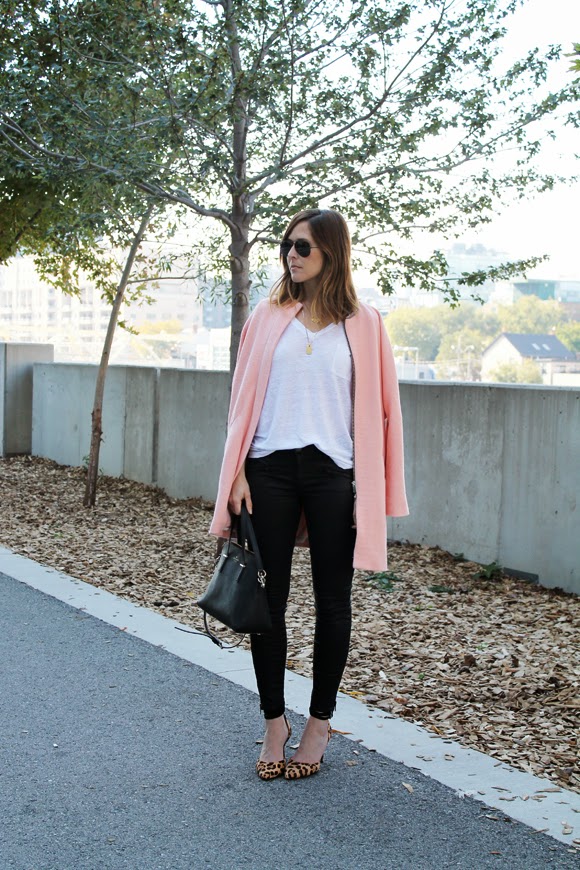 Wearing: Ray-Ban Original Aviators / J.Crew V-neck Tee / Zara Coat (old, similar, similar) / Current Elliot Soho Coated Jeans (c/o, similar for less) / Marais Leopard Pumps (old, similar, similar) / Kate Spade Cedar Street Maise Satchel