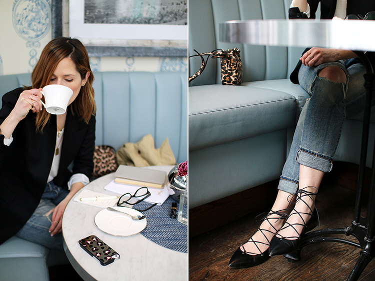 One item that always comes up in my staples list (as seen here, here and here) is a black blazer, and whether you’re dressing for the office, a meeting, a date or the weekend, I believe it’s a piece every girl should own. I particularly love a timeless and simple white tee + blazer + destroyed denim look; and to spruce it up a bit I always rely on 3 things: