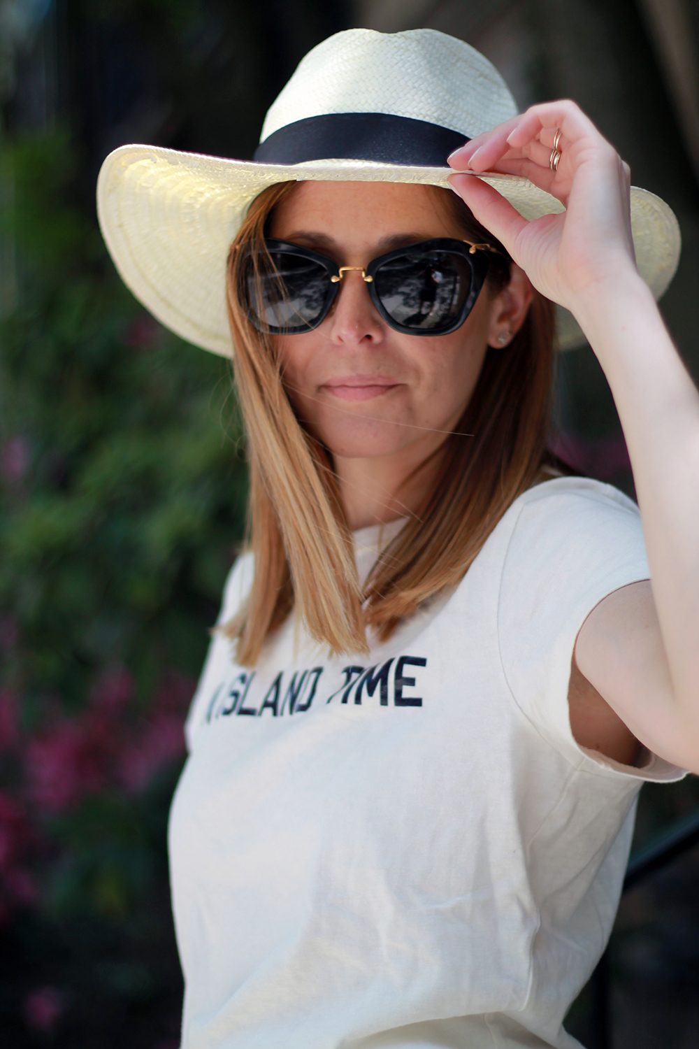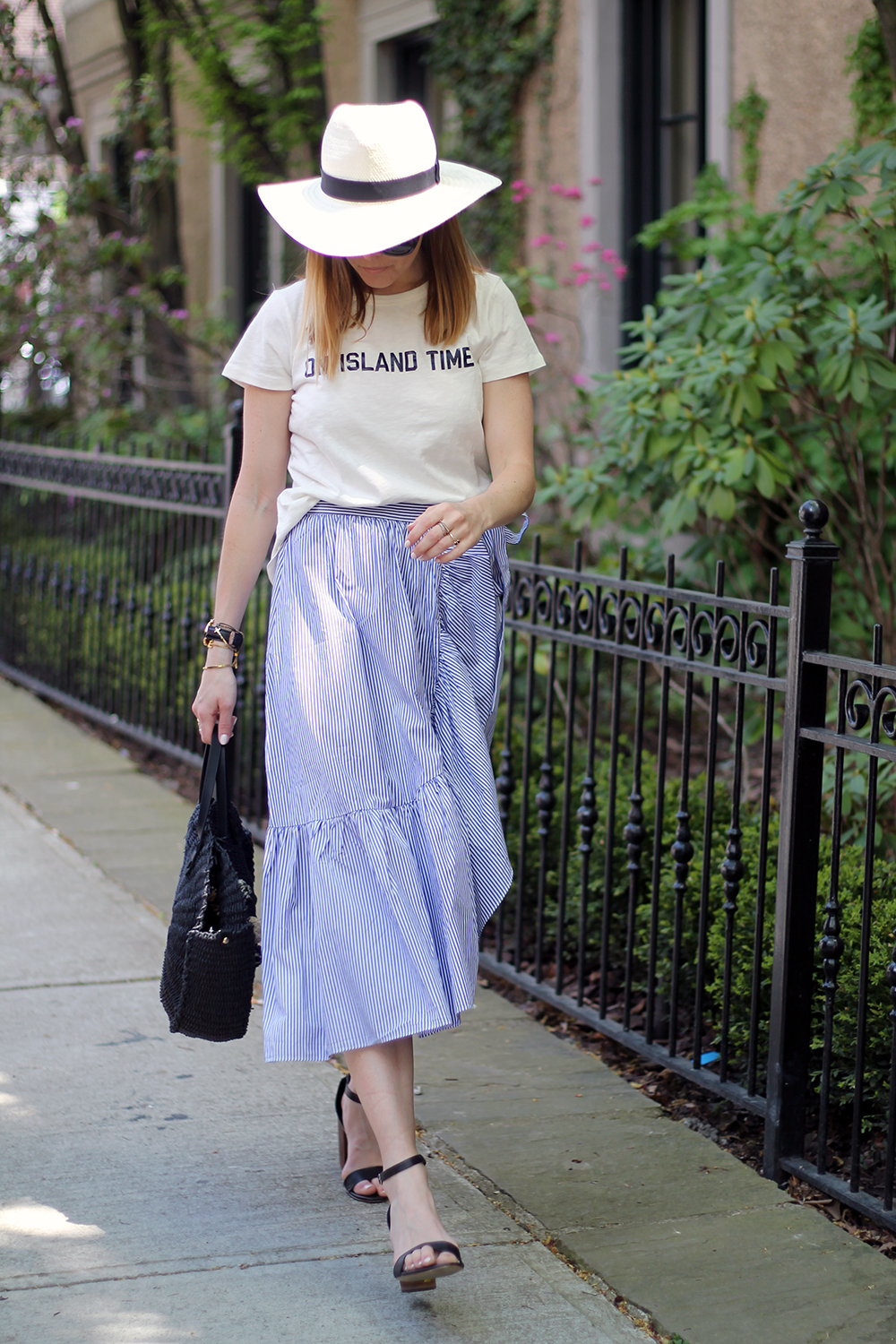 WEARING: Joe Fresh Hat (old, identical) | Miu Miu Sunglasses (a real steal) | J.Crew Island Time T-Shirt (runs small, I’m wearing a Medium) | J.Crew Ruffle Wrap Skirt | Zara Braided Tote | Le Chateau Sandals (old, very similar on sale)