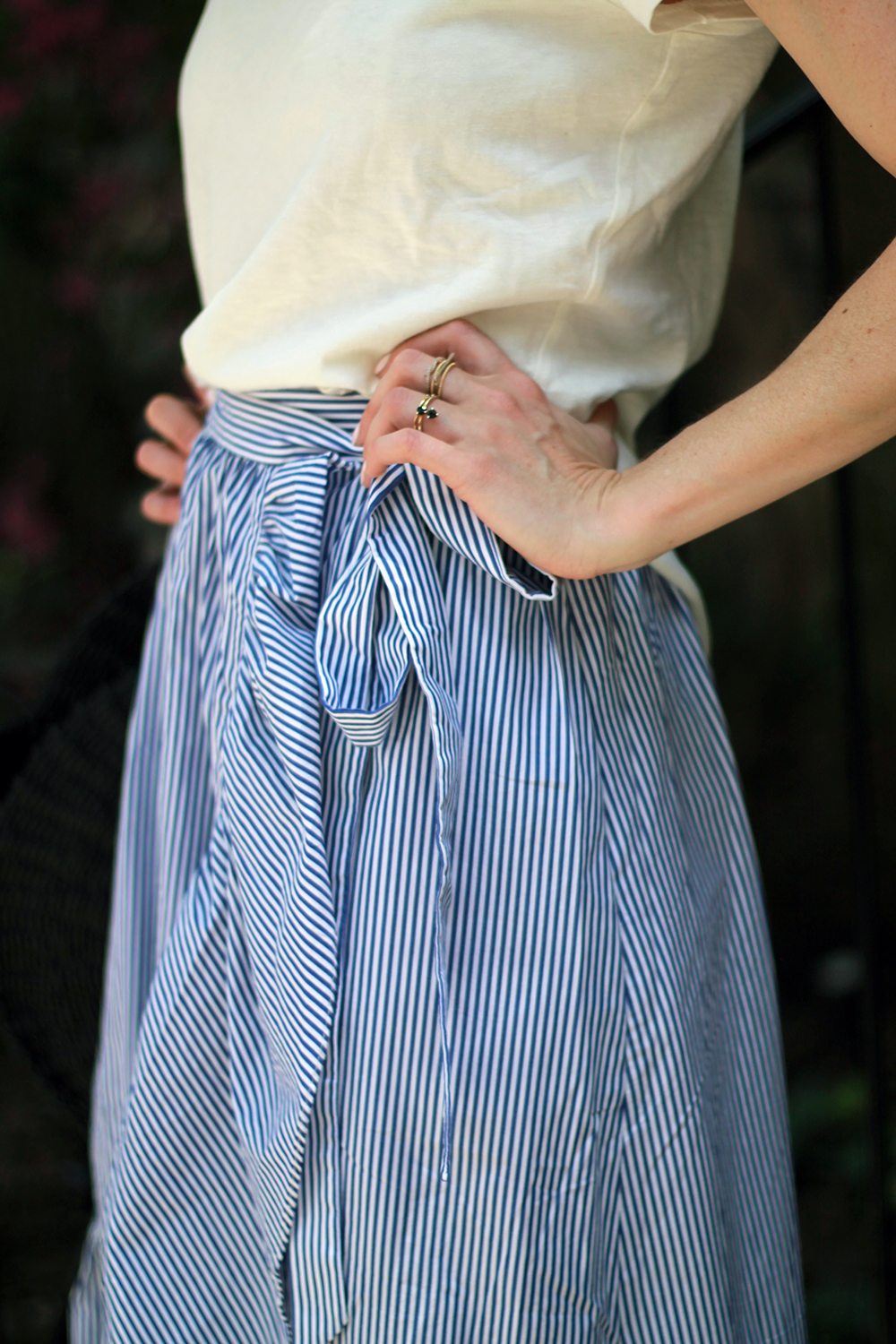 If you’re interested in this skirt and have been eyeing it, it runs true to size (I’m wearing a 0) and it comes with two options to button it up which is great. The striped version seems to be sold out, though they do have it in solid blue and you might be lucky and find this one in stores. The tee runs small, so I went with a Medium. Wishing everyone a good week, and lots of strength for those affected by these tragedies.