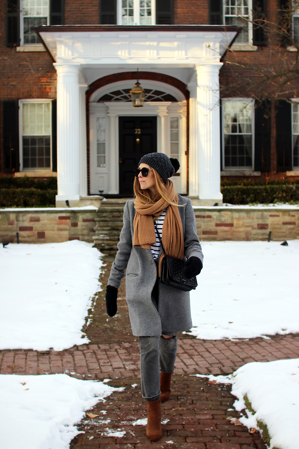 WEARING: J.Crew Factory Beanie (sold out, but here’s a similar one) | Sunglasses similar to these and these | J.Crew Striped Tee (old, similar to this one and this one, both by J.C) | Zara Coat (old, similar here) | Citizens of Humanity Liya High Waist Boyfriend Jeans | Sam Edelman Booties (similar here) | Rebecca Minkoff Love Crossbody | J.Crew Chashmere Scarf (old, similar here)