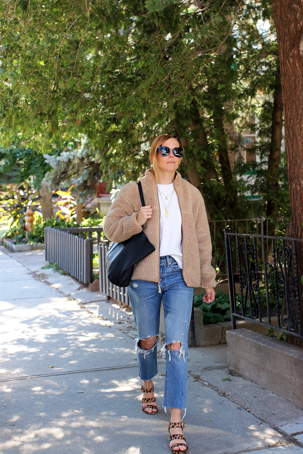 WEARING: Miu Miu Sunglasses | Madewell Sweater (old, similar) | TNA Sherpa Fleece Jacket | Levi’s Wedgie Straight Leg Jeans | J.Crew Leopard Sandals (they are one sale!) | Rebecca Minkoff Studded Tote (old, similar here)