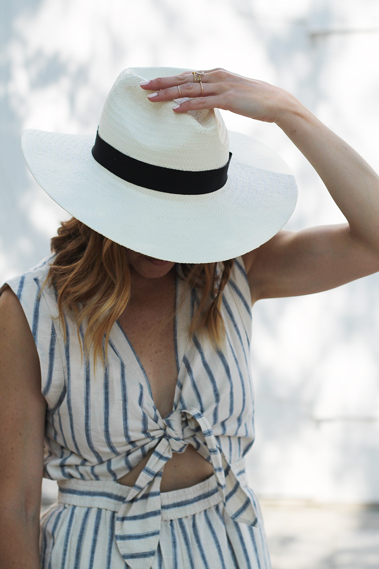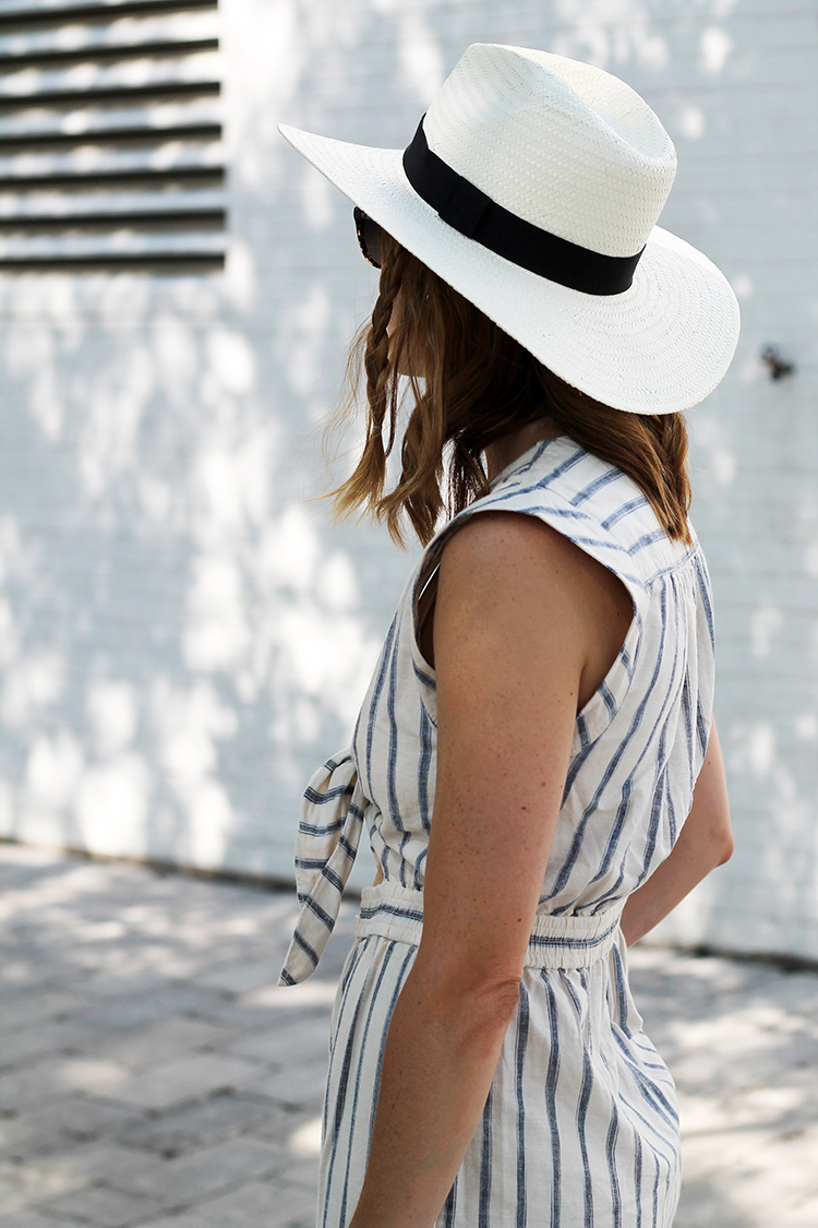 WEARING: Madewell Tie-Front Culotte Jumpsuit (on sale!) | Seavees for J.Crew Sneakers (similar) | Chapters Indigo The Great Canadian Weekender | Joe Fresh Panama Hat (just $9!) | Etnia Barcelona Ferlandina Sunglasses (gifted) | J.Crew Denim jacket