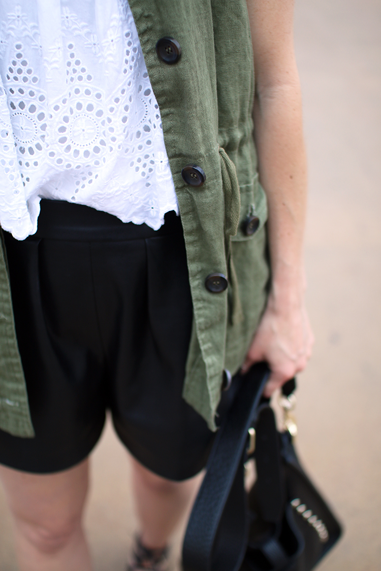 Utility vests are the Summer versions of the utility jackets you wear in Spring and Fall, and I love them because they are a great way to add a layer while still keeping your look weather appropriate. I personally love the contrast with delicate pieces such as eyelet tops and dresses and I definitely consider them a Summer wardrobe staple. The one I’m wearing is an oldie from Forever 21, but I found three similar ones here, here and here.