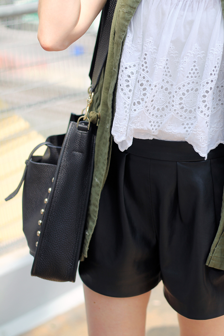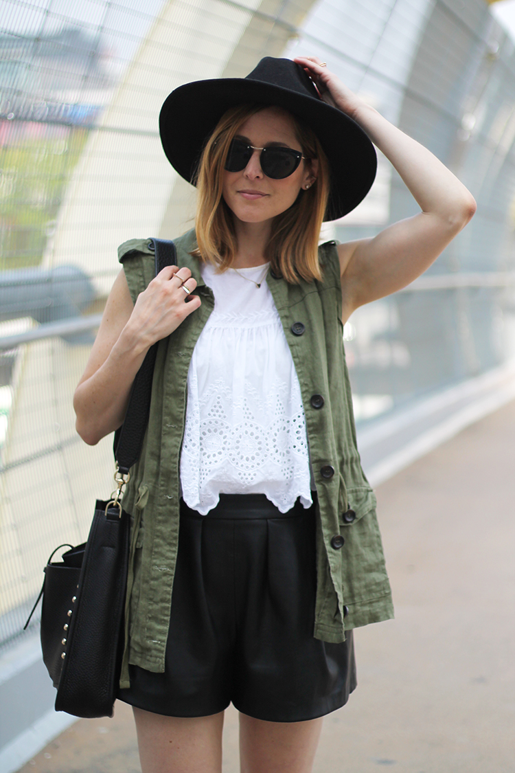 GET THE LOOK: Joe Fresh Wide Brim Fedora (old, similar) | Spitfire Helix Sunglasses (old, similar, similar) | Zara Eyelet Top (old, similar, similar) | Forever 21 Cargo Vest (old, similar) | Zara Faux Leather Bermudas (old, similar) | Rebecca Minkoff Unlined Feed Bag (gifted, on sale!) | J.Crew Gladiator Sandals (old, similar from J.Crew also, similar for less than $50)